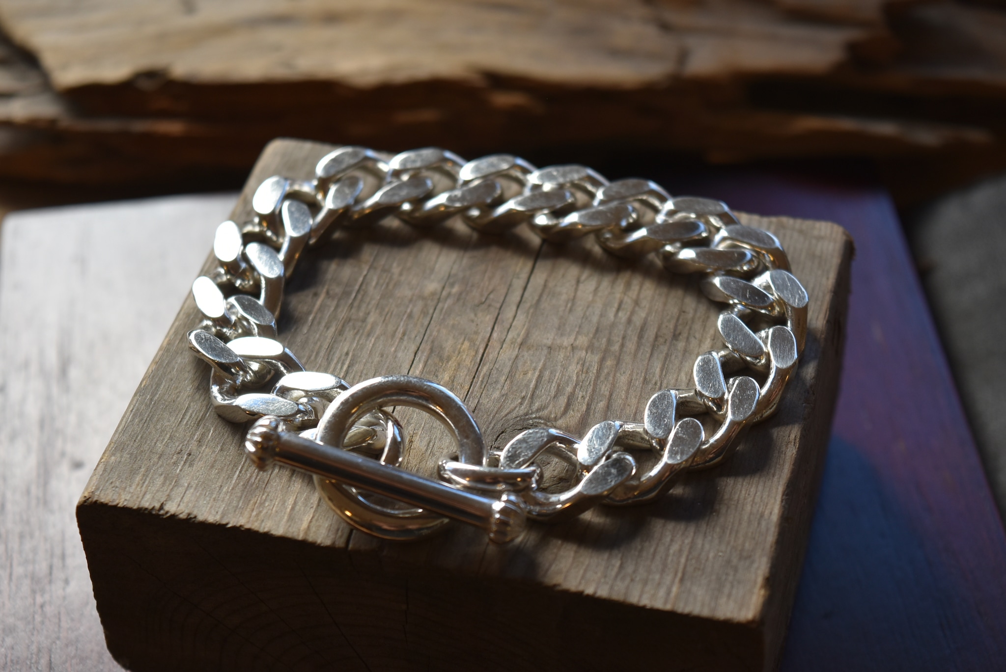 今回ご紹介するのは、ズッシリとした重さとシルバーの輝きが魅力の大ぶりの喜平チェーンを使用したブレスレット。