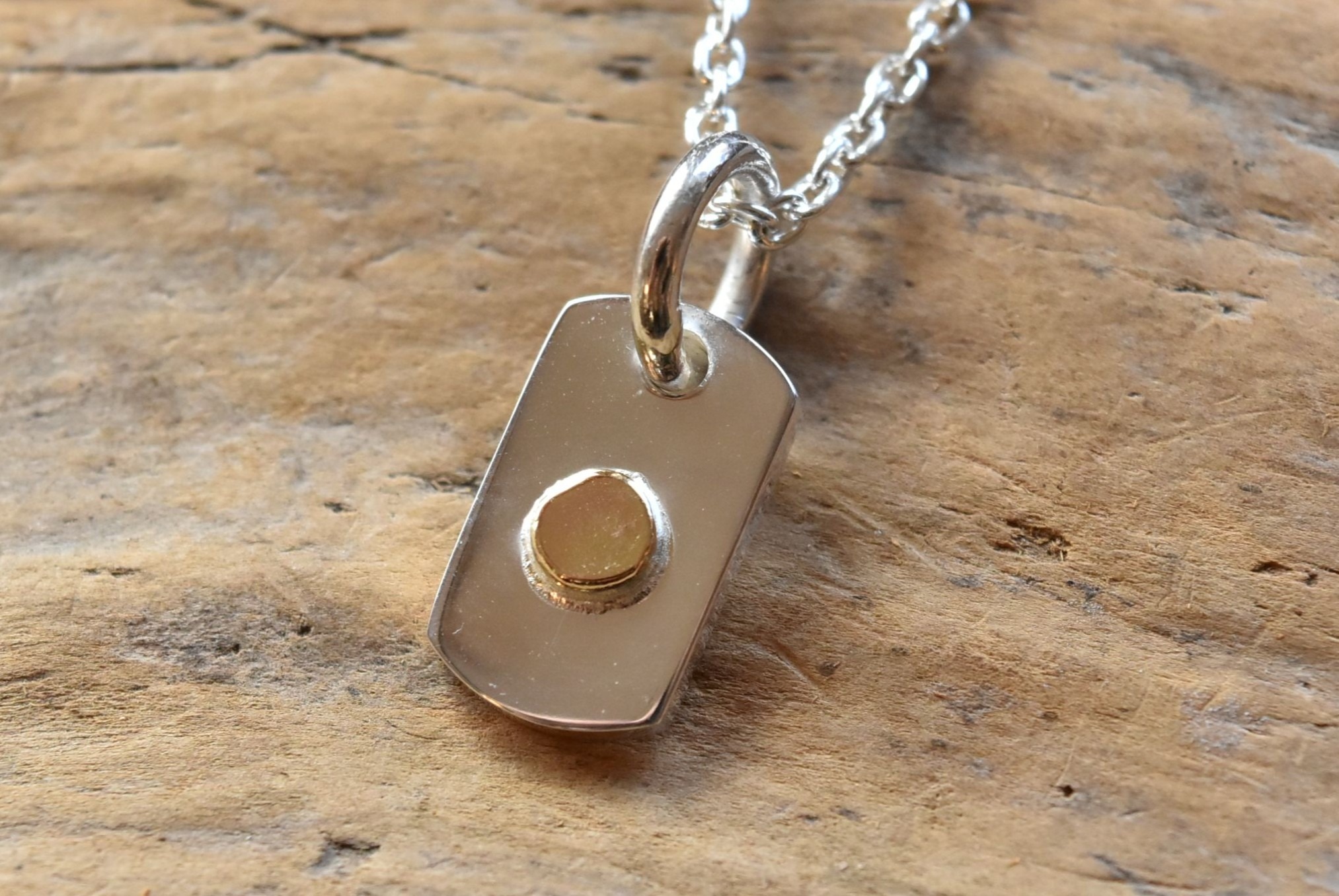 今回ご紹介するのは、短冊型のベース上にワンポイント18Kゴールドを丸型にして組み合わせた、小さくもゴールドの良さを楽しめるミニペンダント!