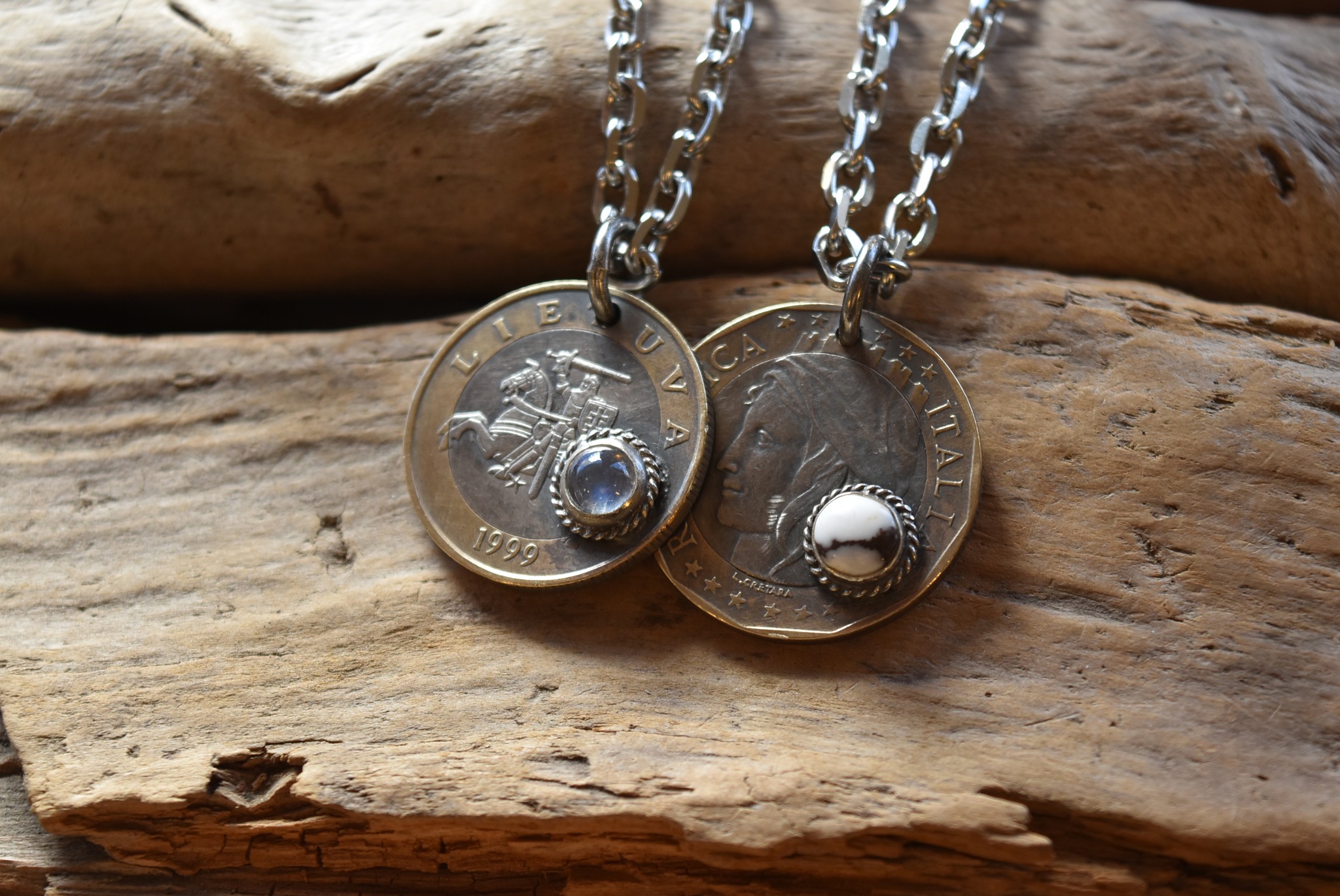お二人の生まれた西暦のコインをアンティーク加工でペンダントに加工し、ムーンストーンとワイルドホースを留めた素敵仕様!
