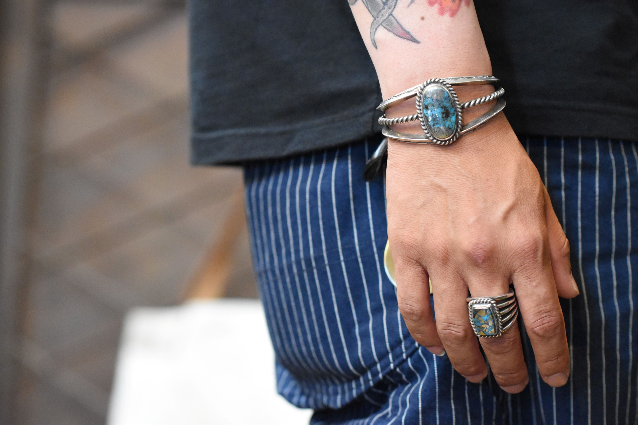 大ぶりのターコイズを使った3ラインバングル、スクエア型の5ラインリング。