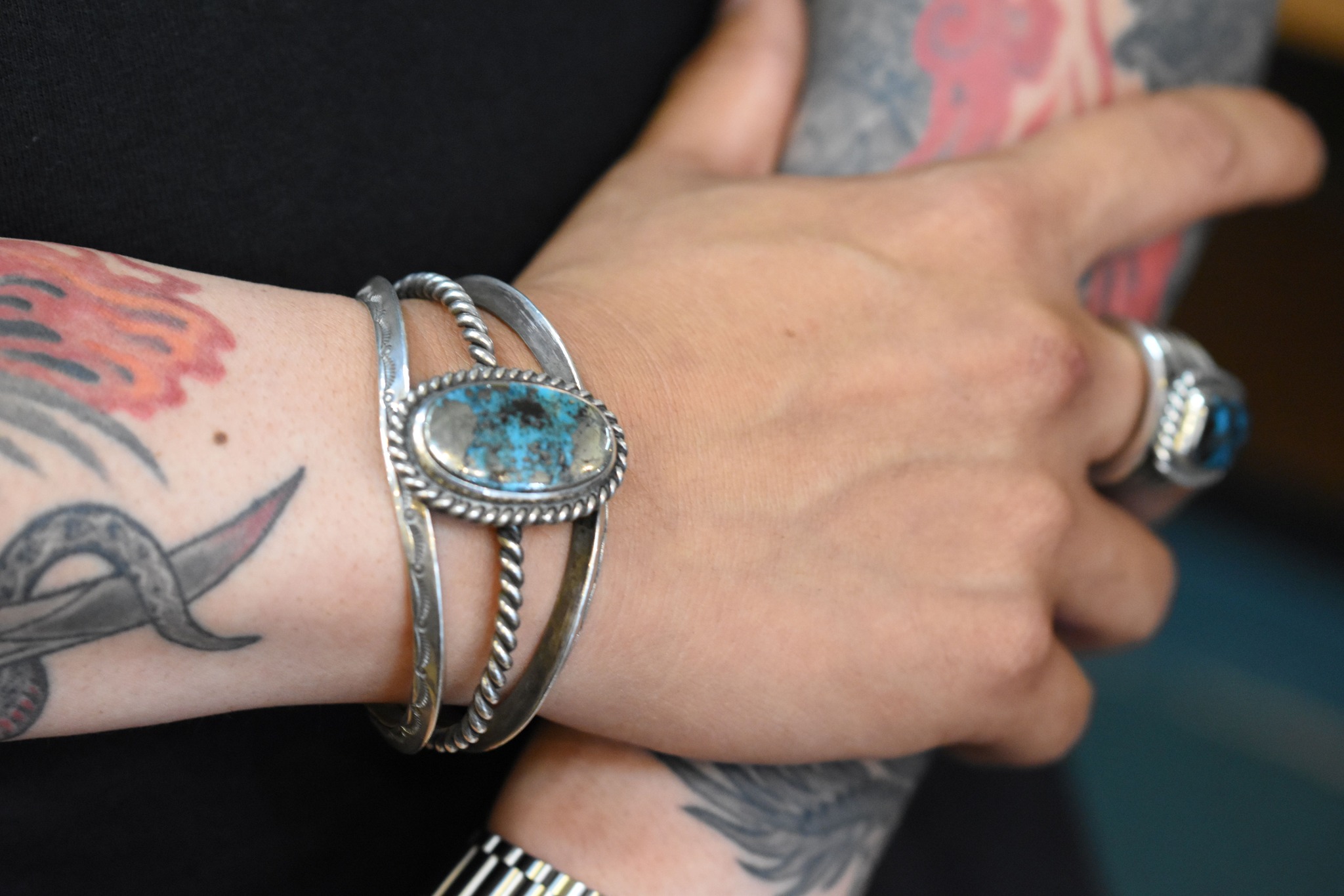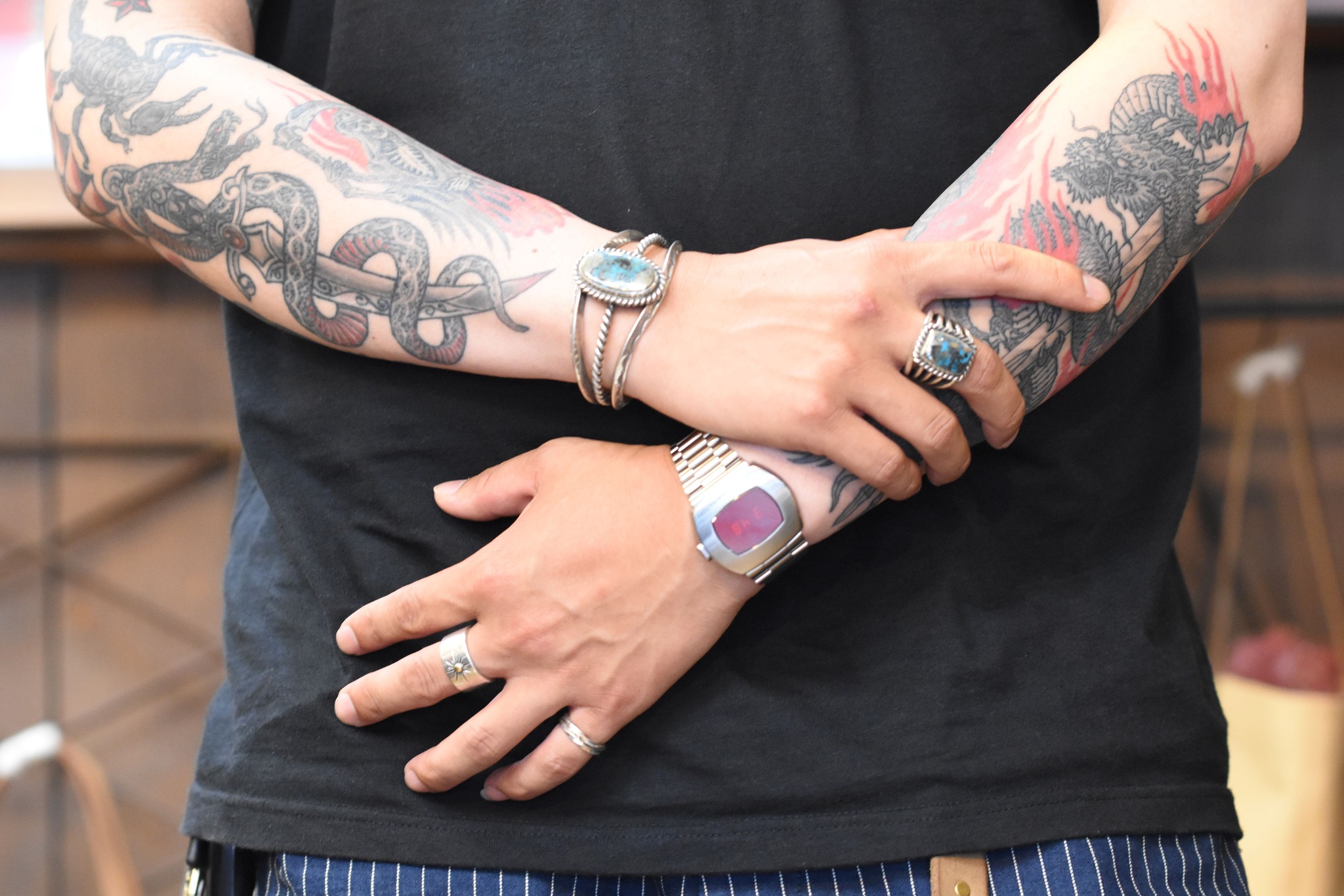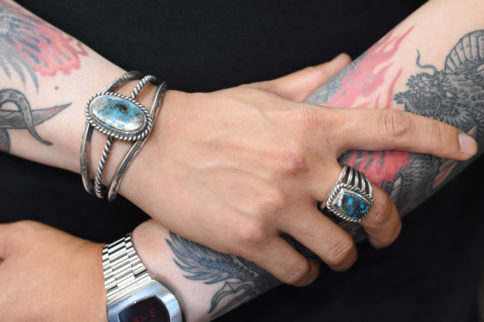 今回ご紹介するお客様は、タトゥーが映える腕元に、当店で根強い人気を誇るペルシャターコイズを使用したアクセサリーを重ねたコーディネート。