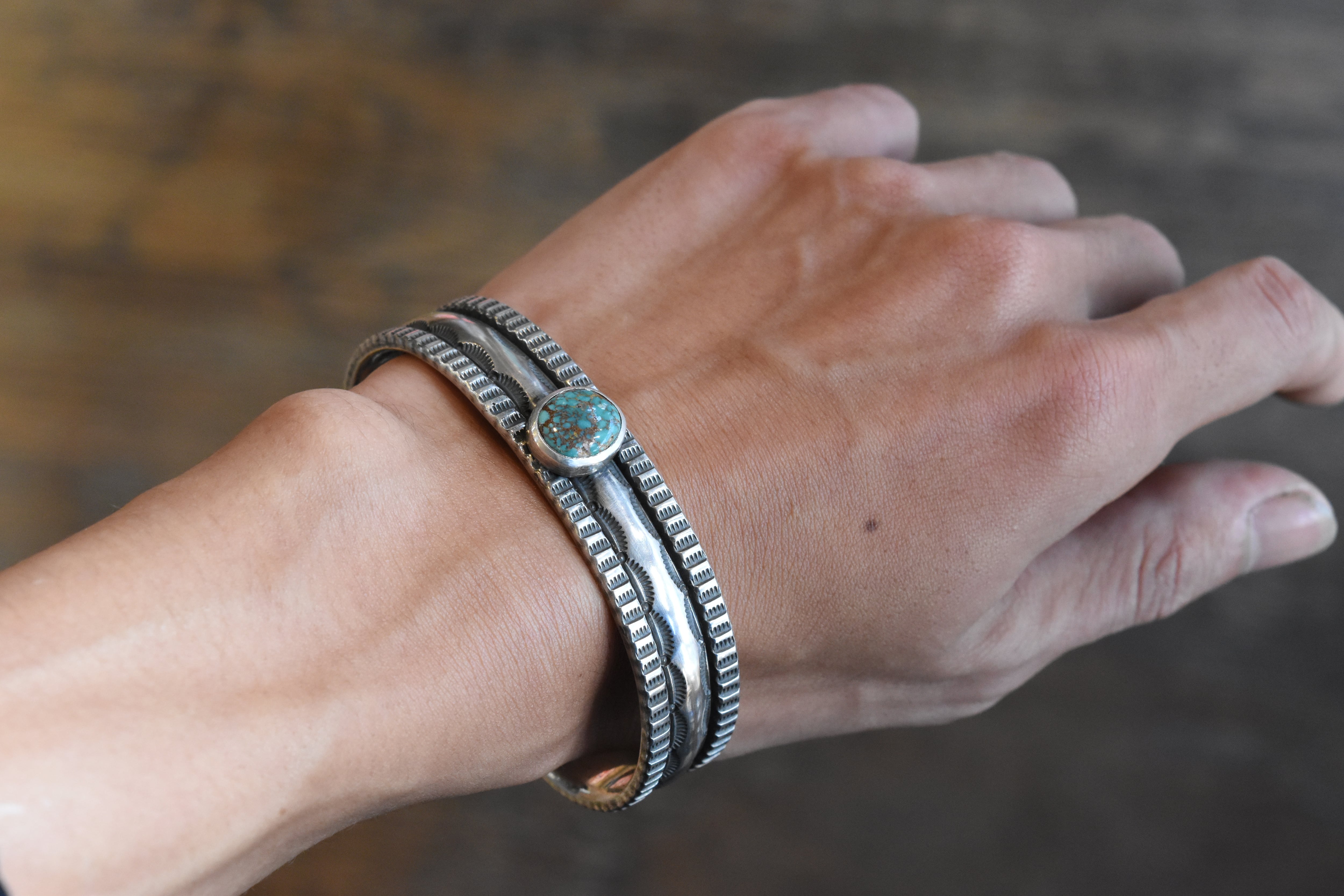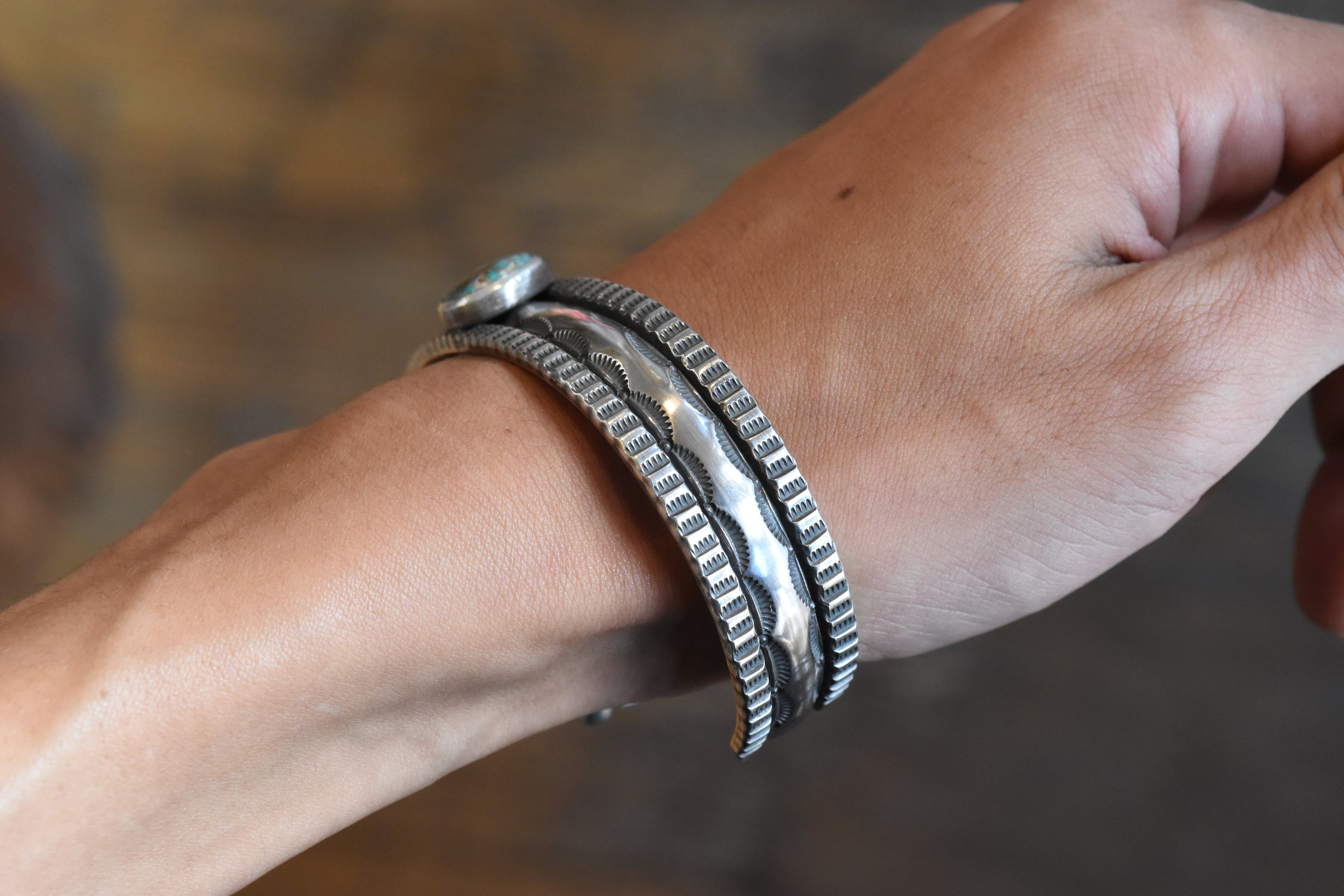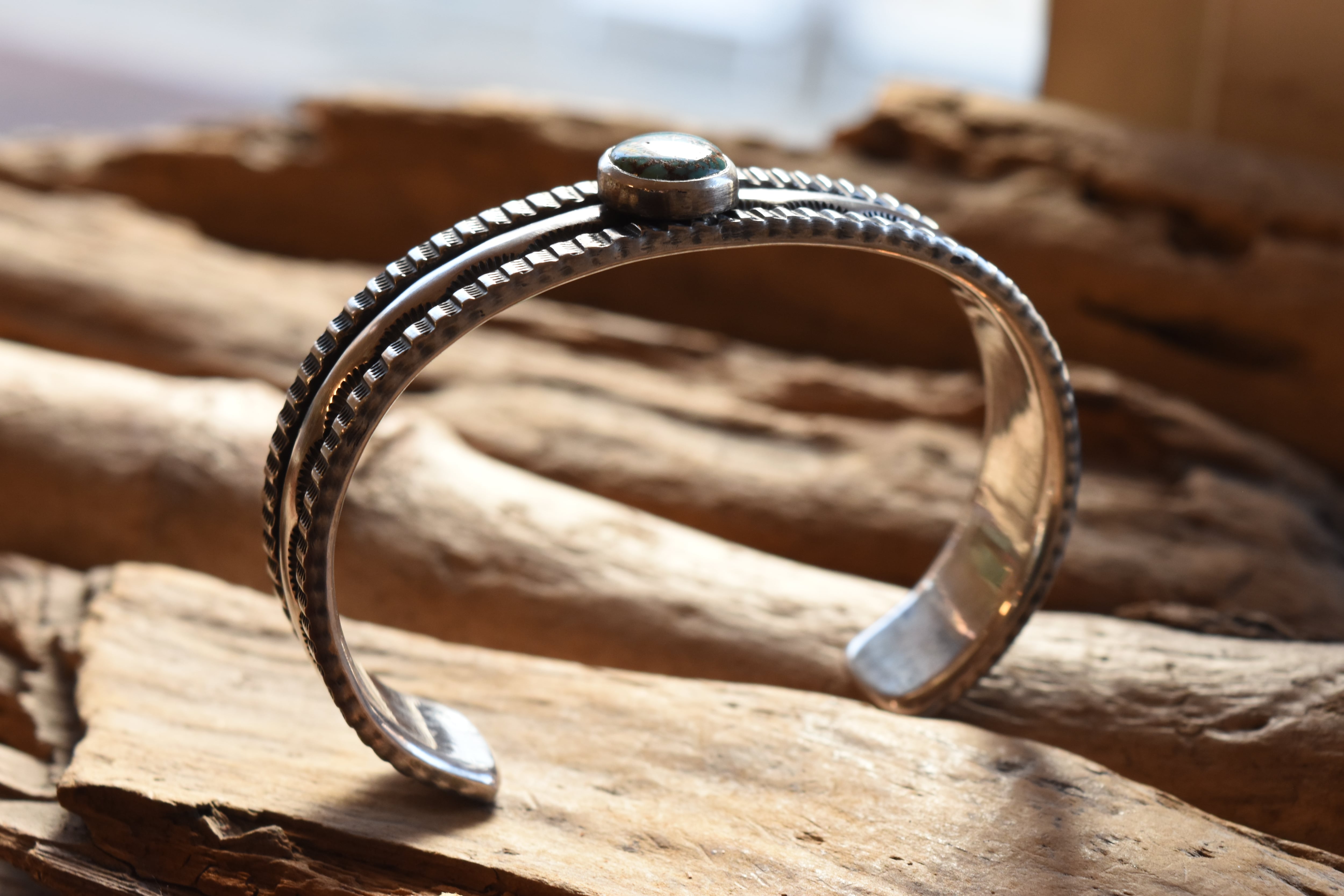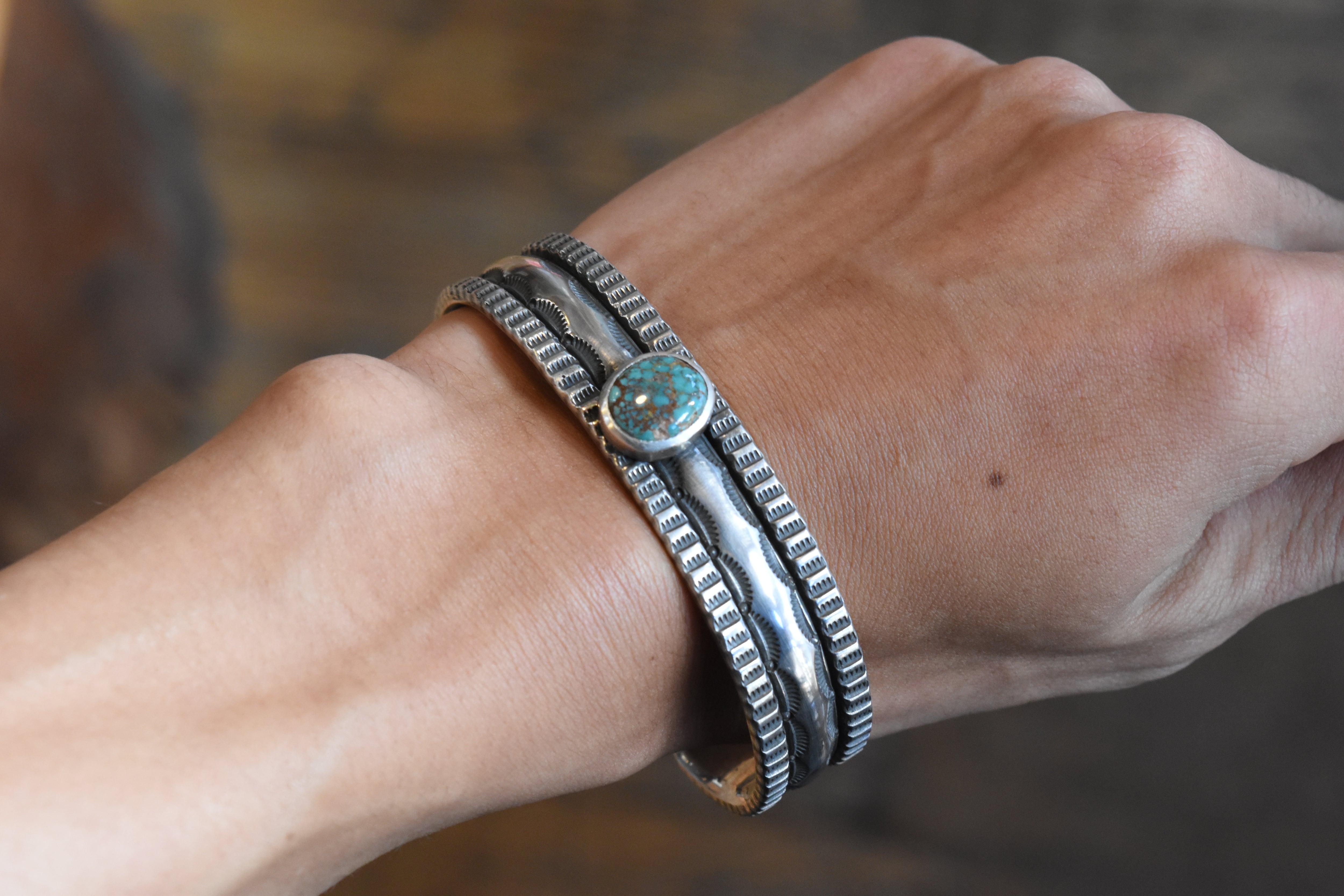 エジプシャンターコイズを贅沢に使用したチゼルスタンプバングルは、独特な模様が施された魅力を放っています。