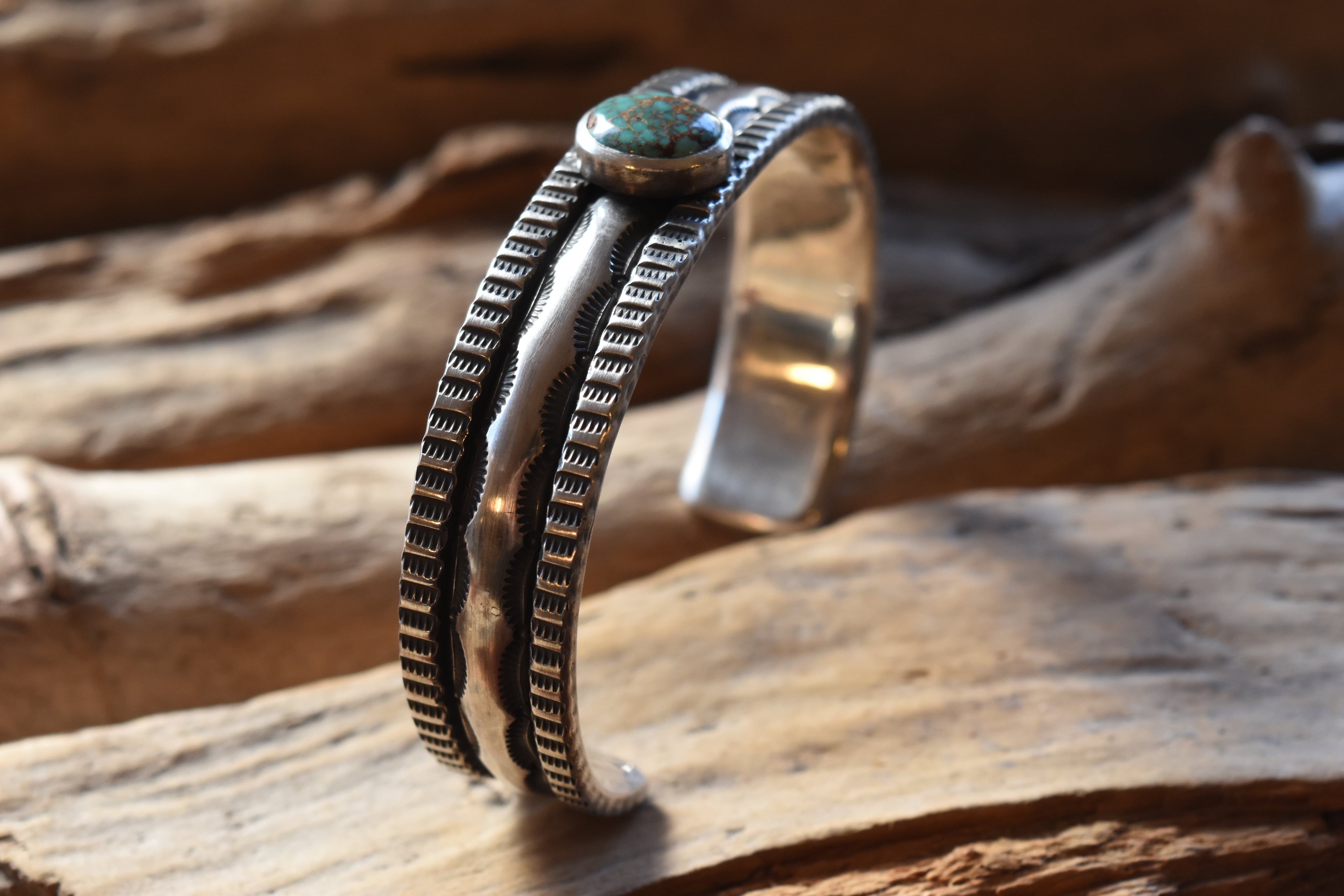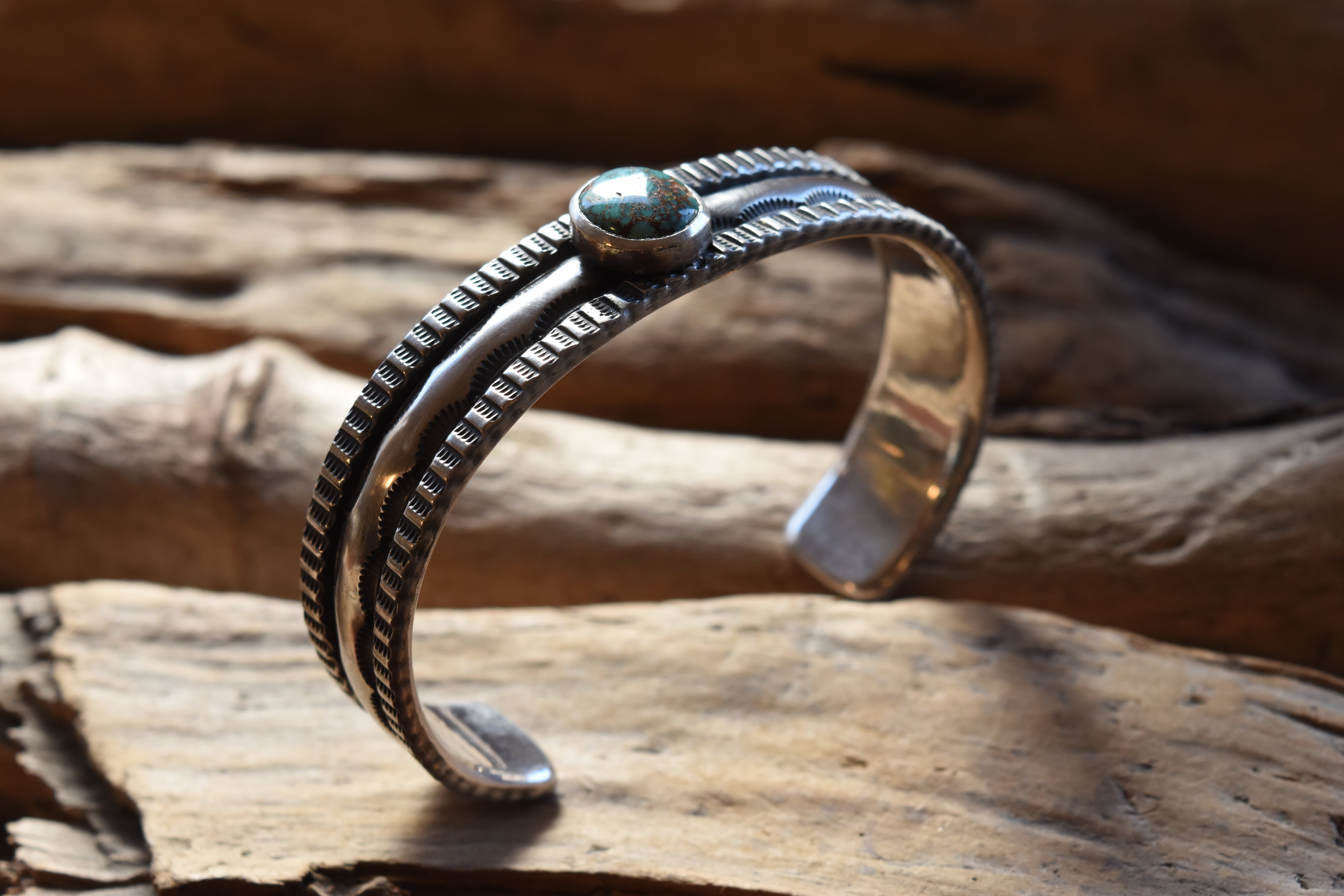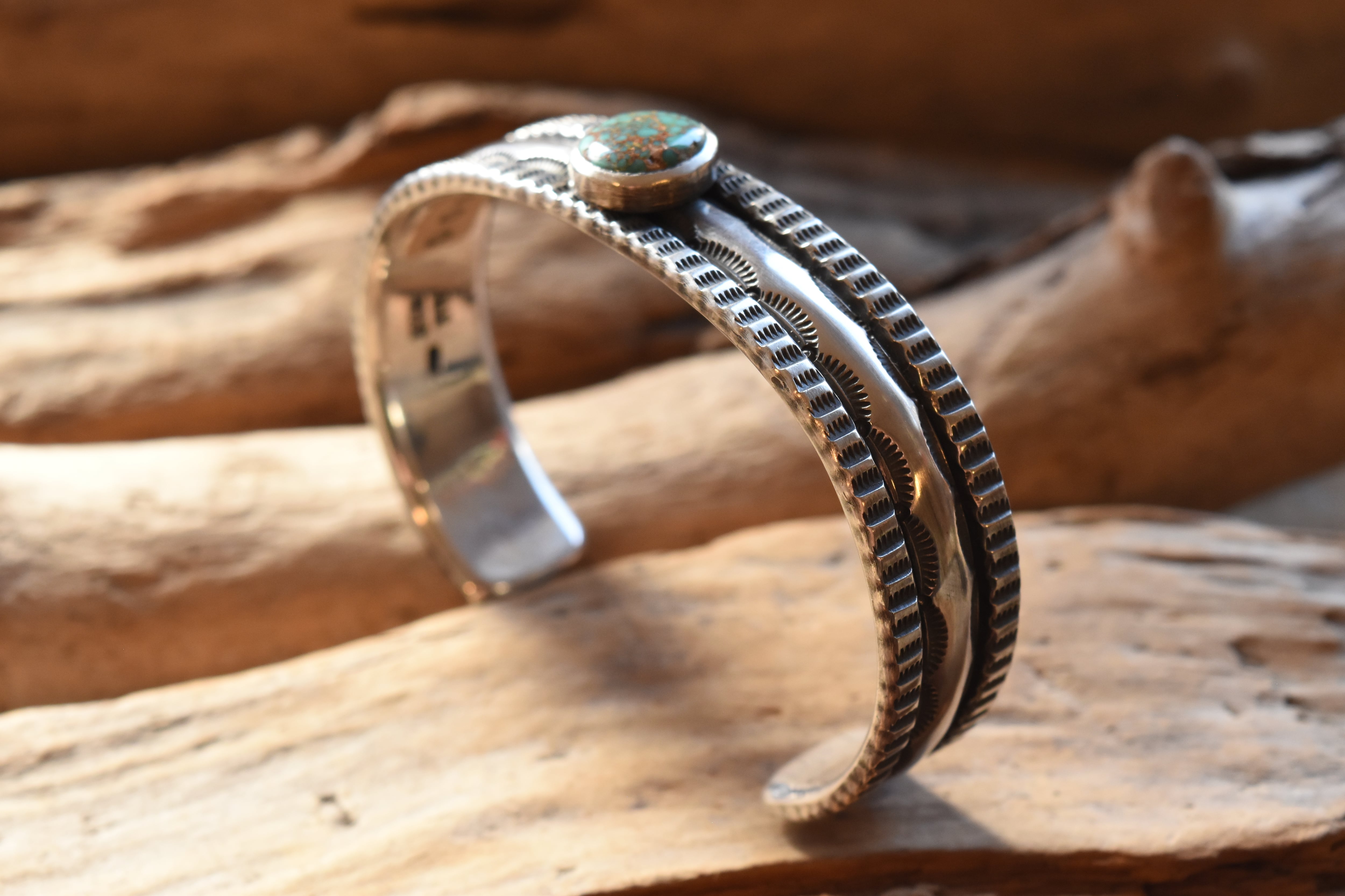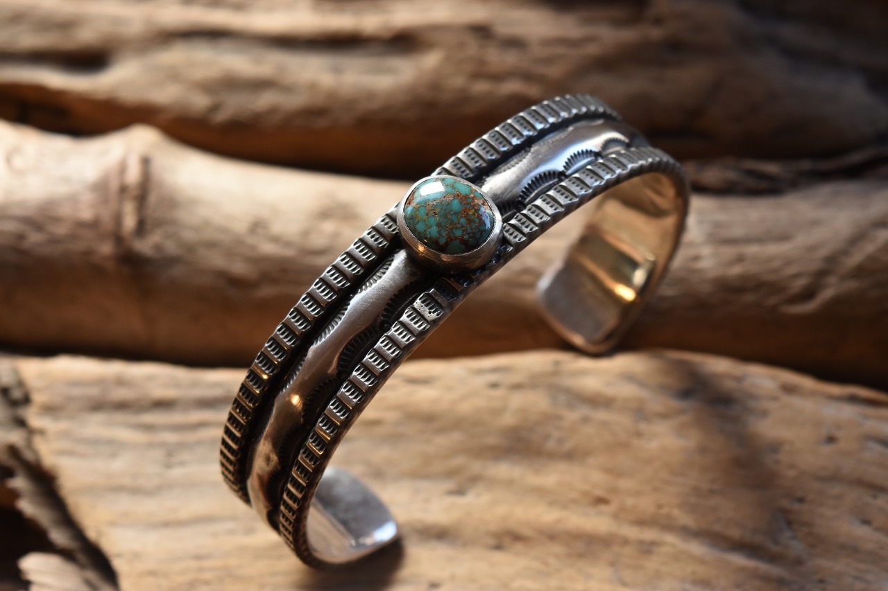 エジプシャンターコイズを贅沢に使用したチゼルスタンプバングルは、独特な模様が施された魅力を放っています。