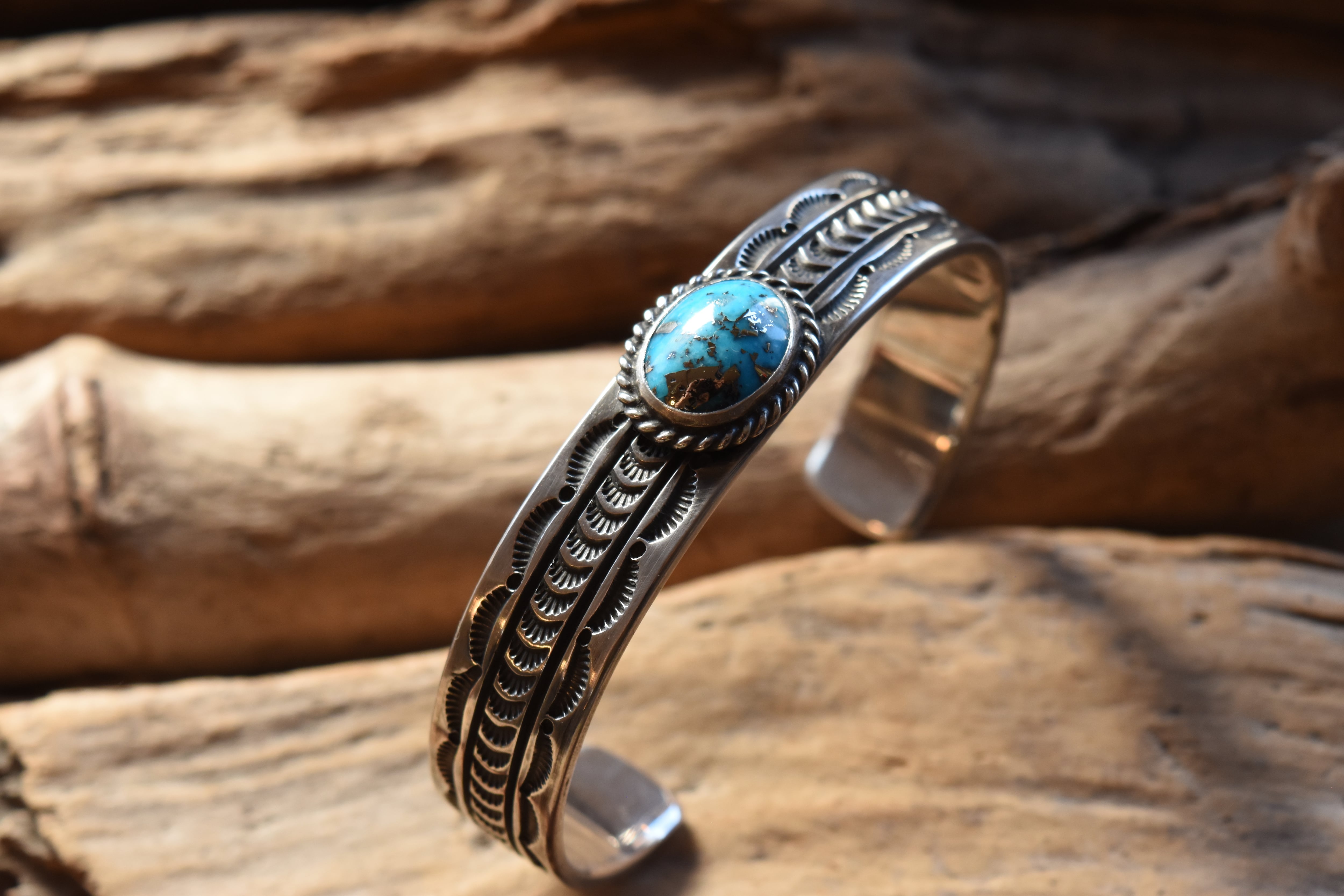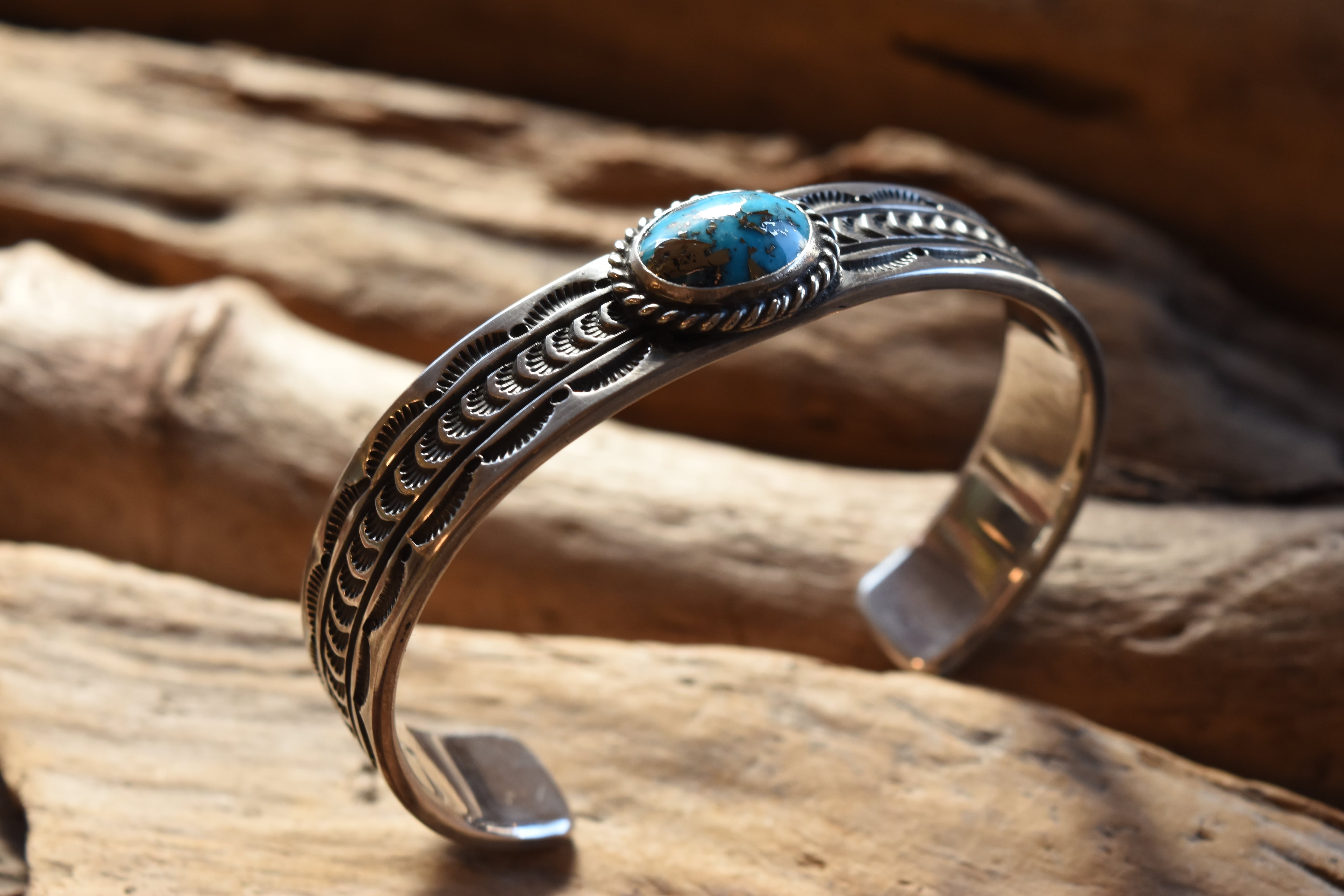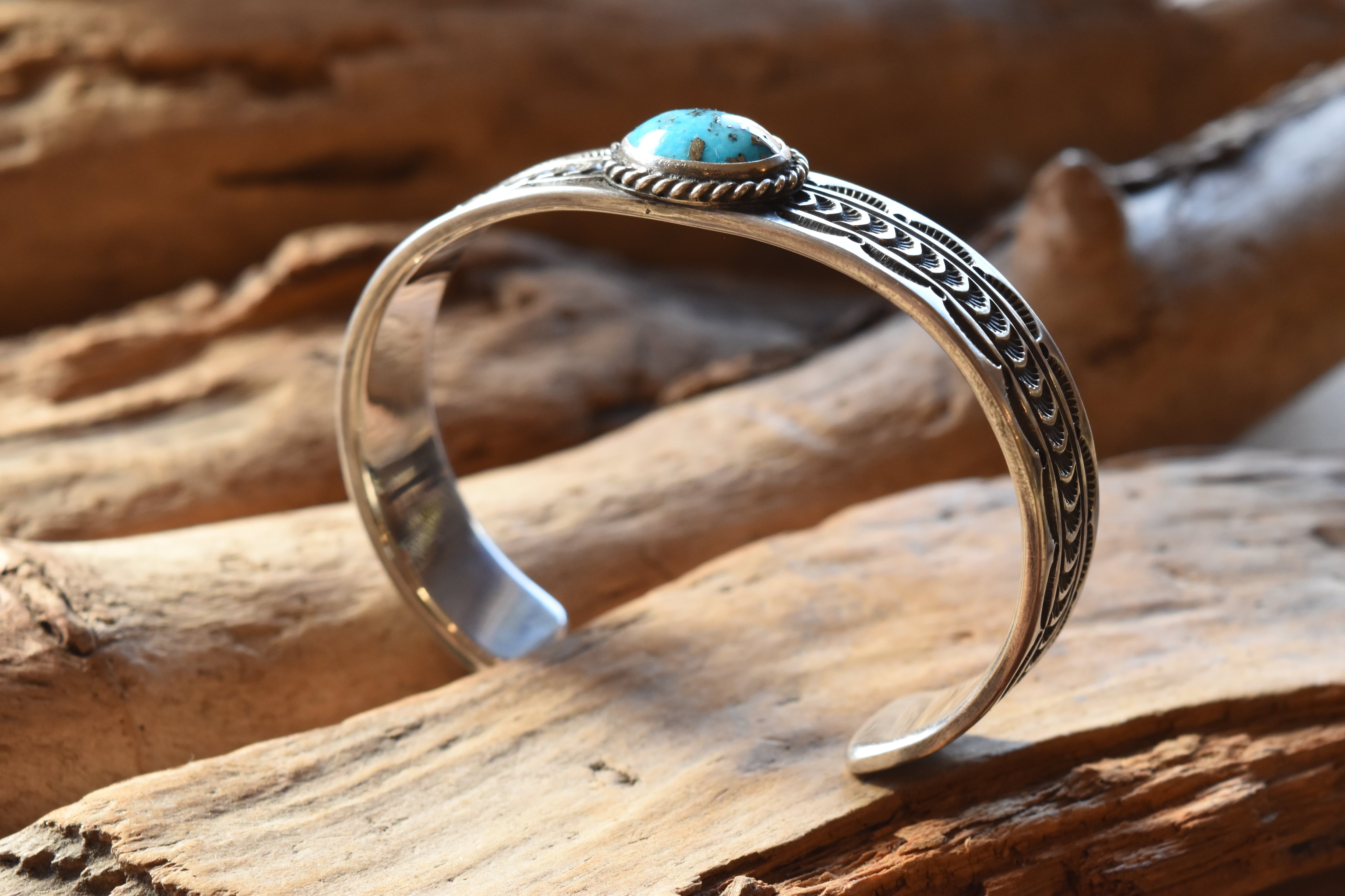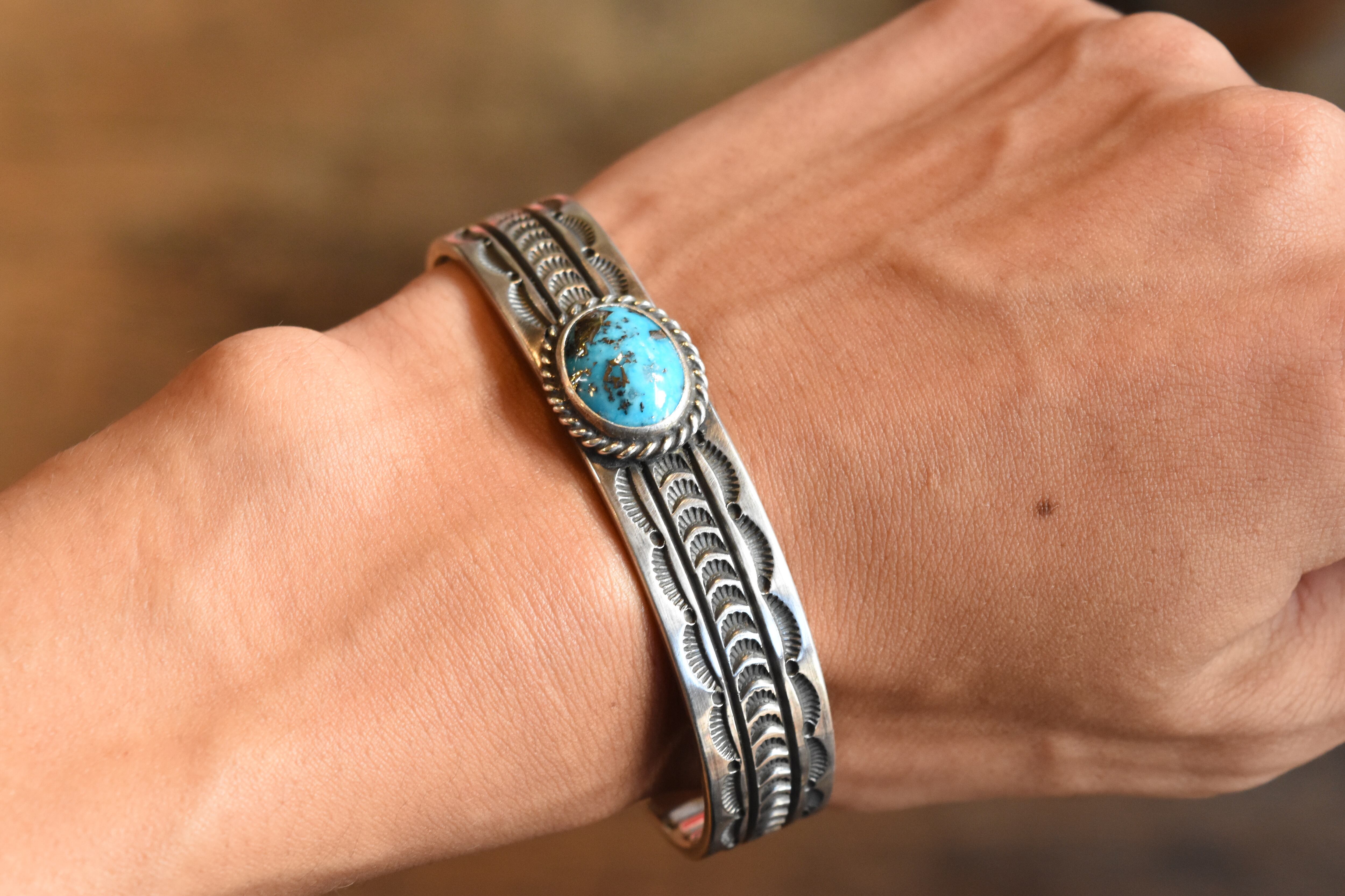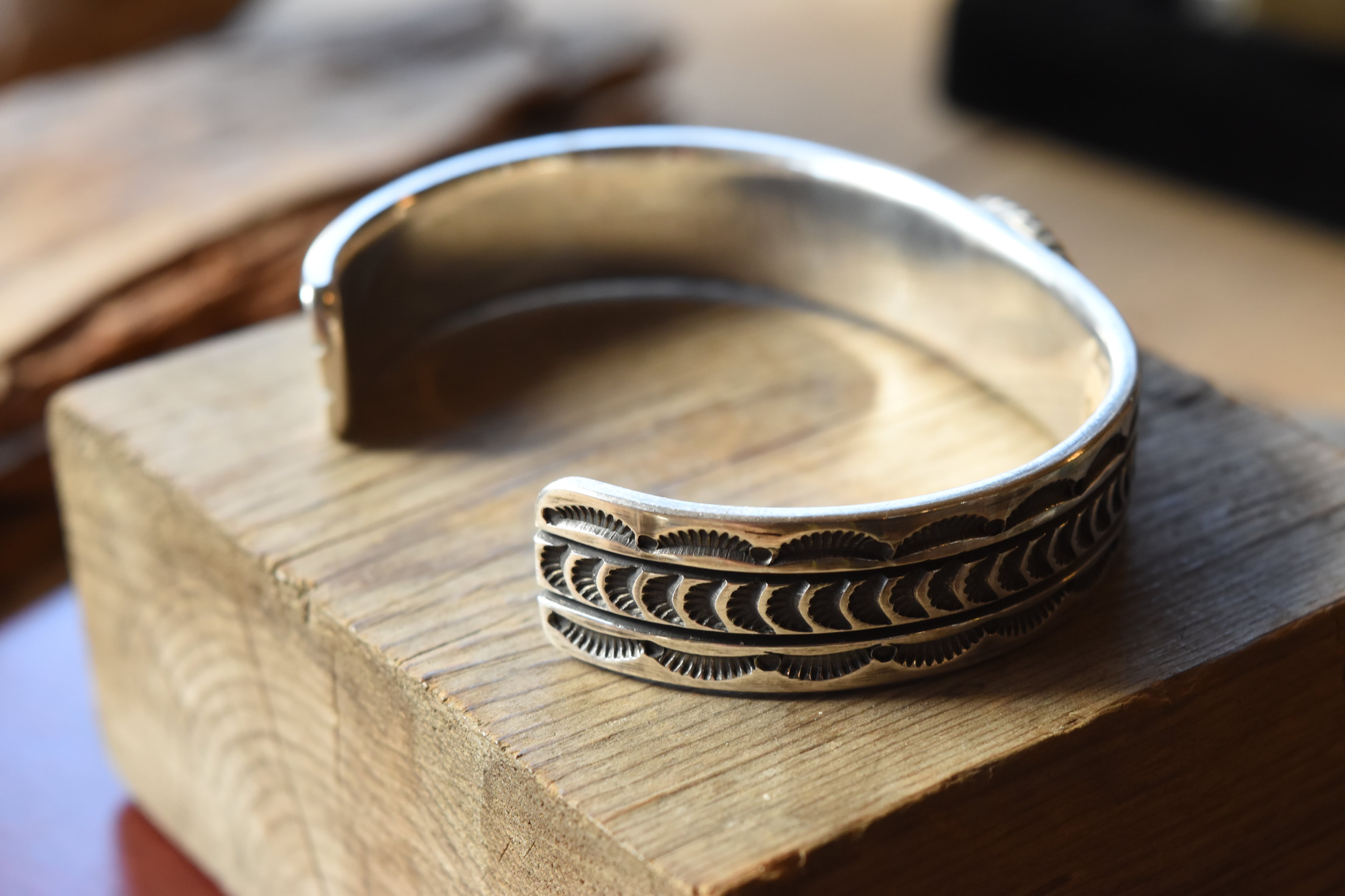 ペルシャターコイズならではの色合いと輝きが、スタンプ加工によって生み出された精緻な模様と相まって、独特の美しい輝きを演出してくれます。