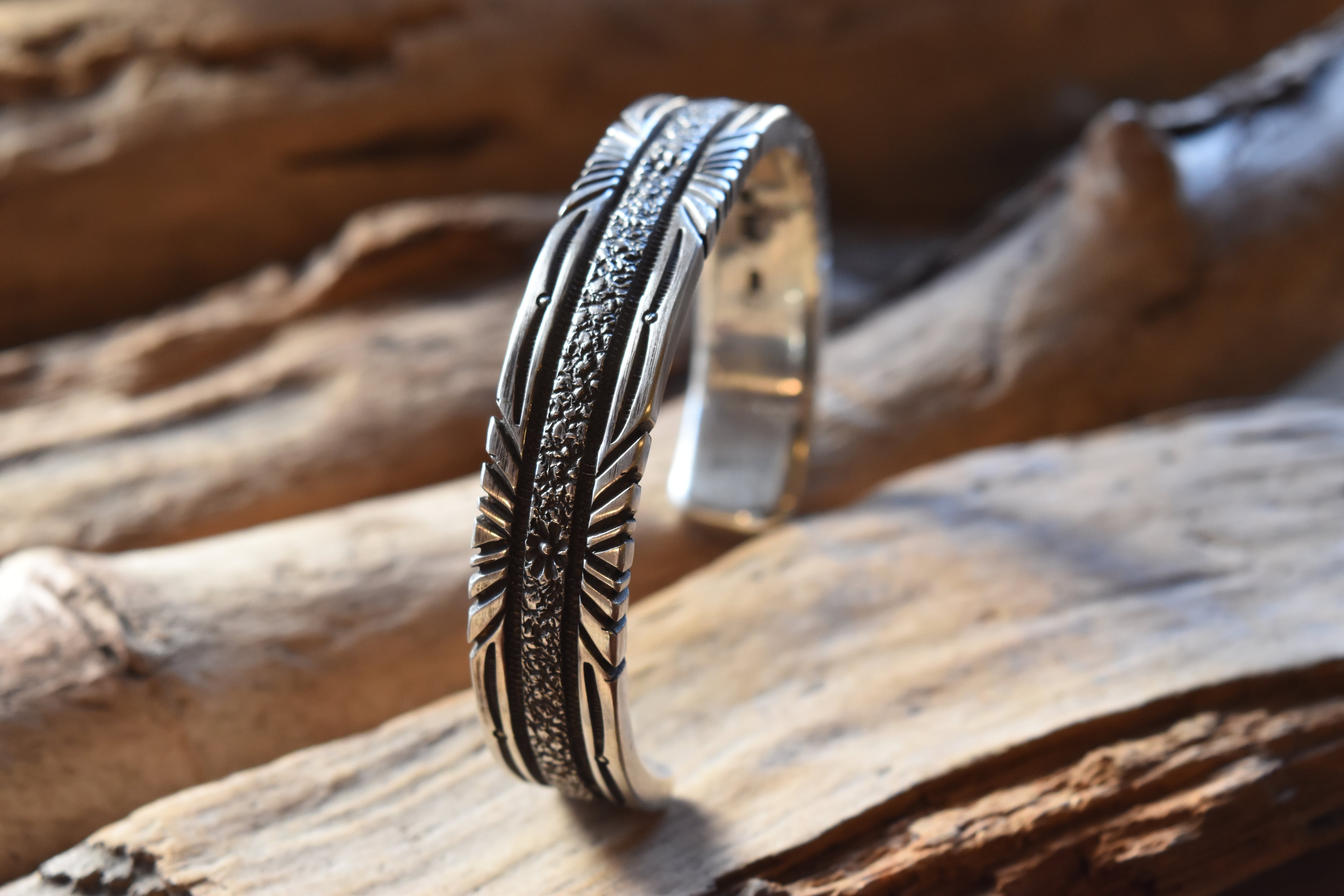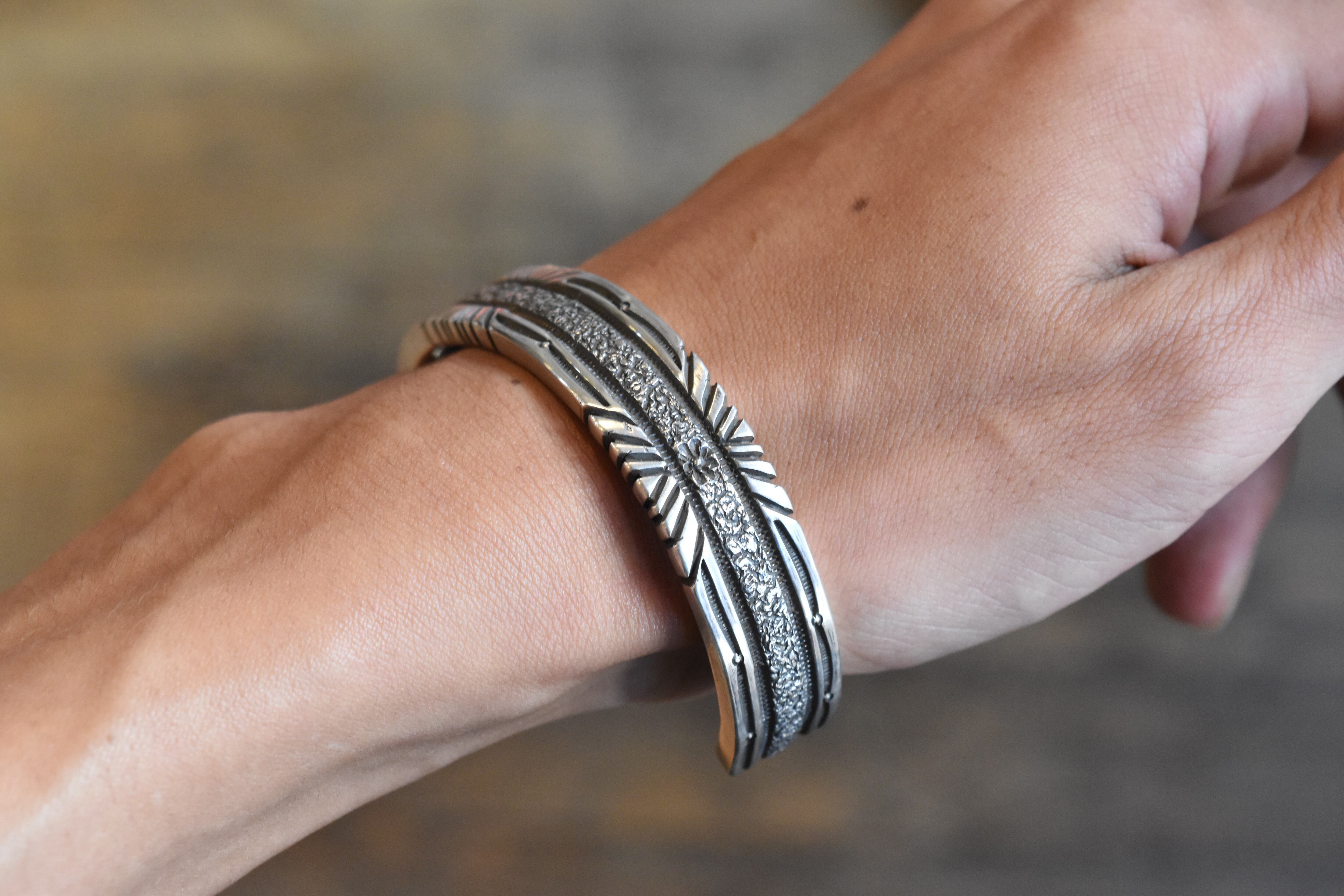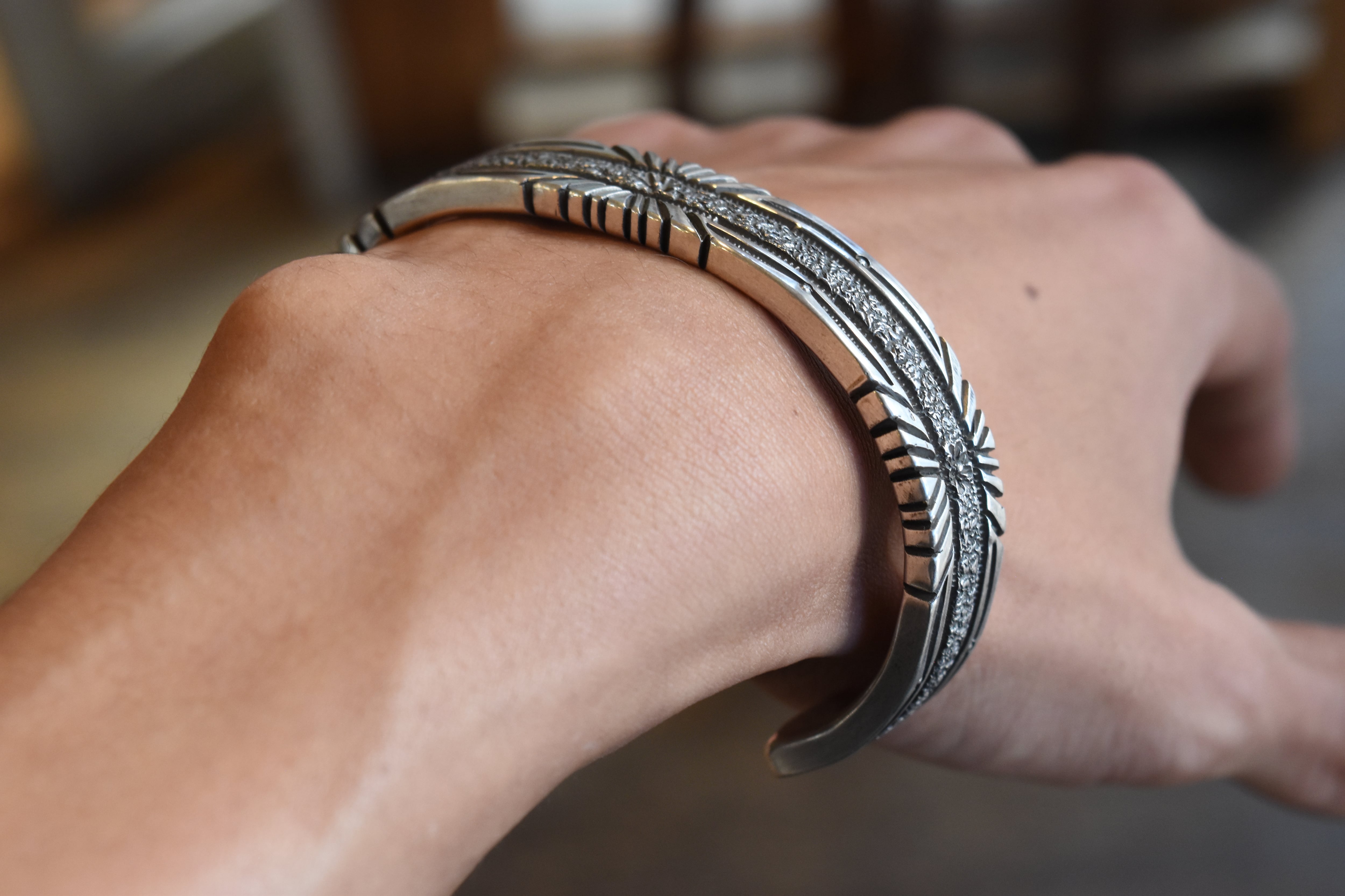 しっかりとした地金を使用しており、しなやかでありながら重量感のあるフォルムが特徴。職人の丁寧な仕上げが施されており、サンバーストの美しい色合いが手元に華やかさを添えます。普段使いから特別なシーンまで幅広く対応できる洗練されたアイテムとして、大変重宝できます。