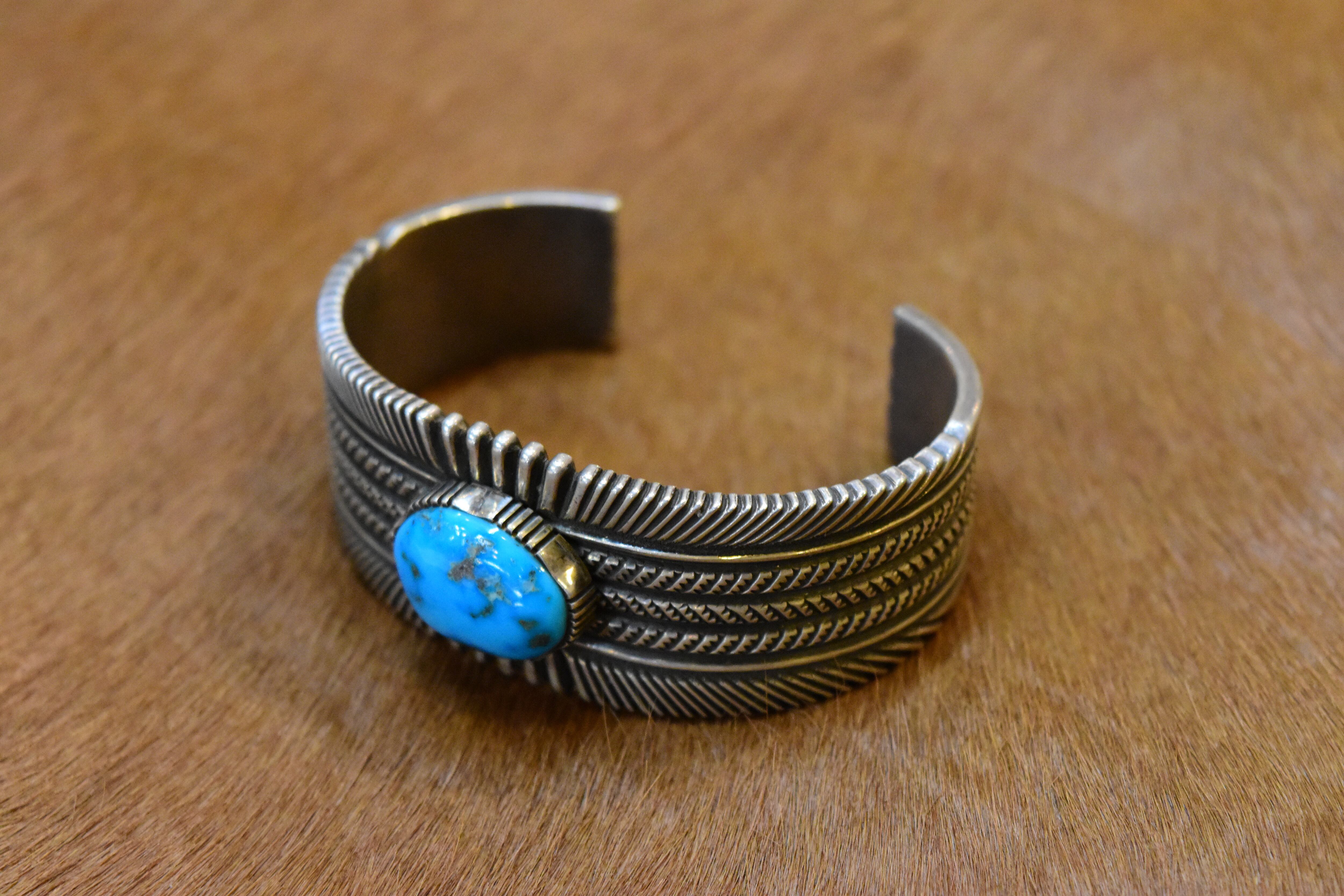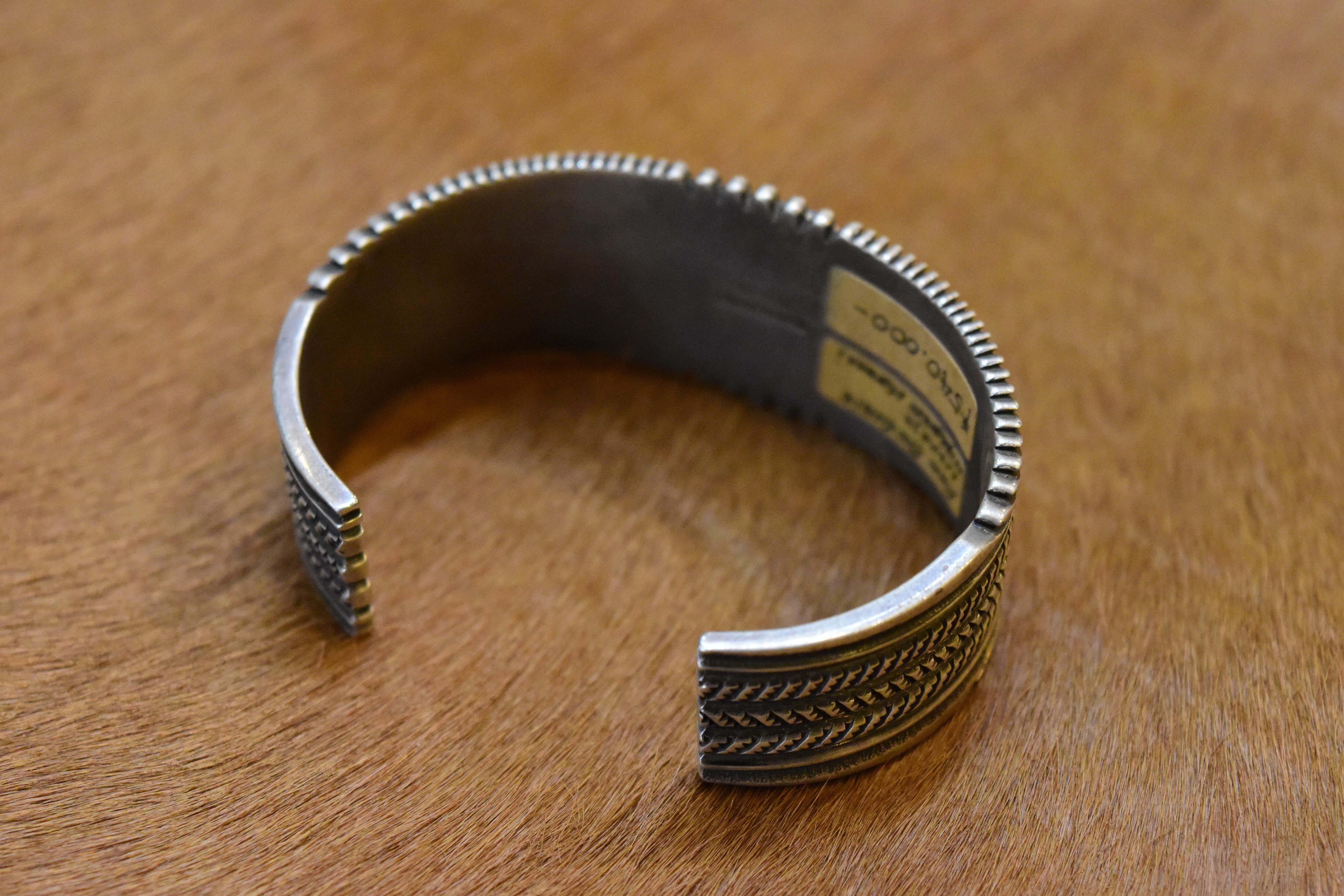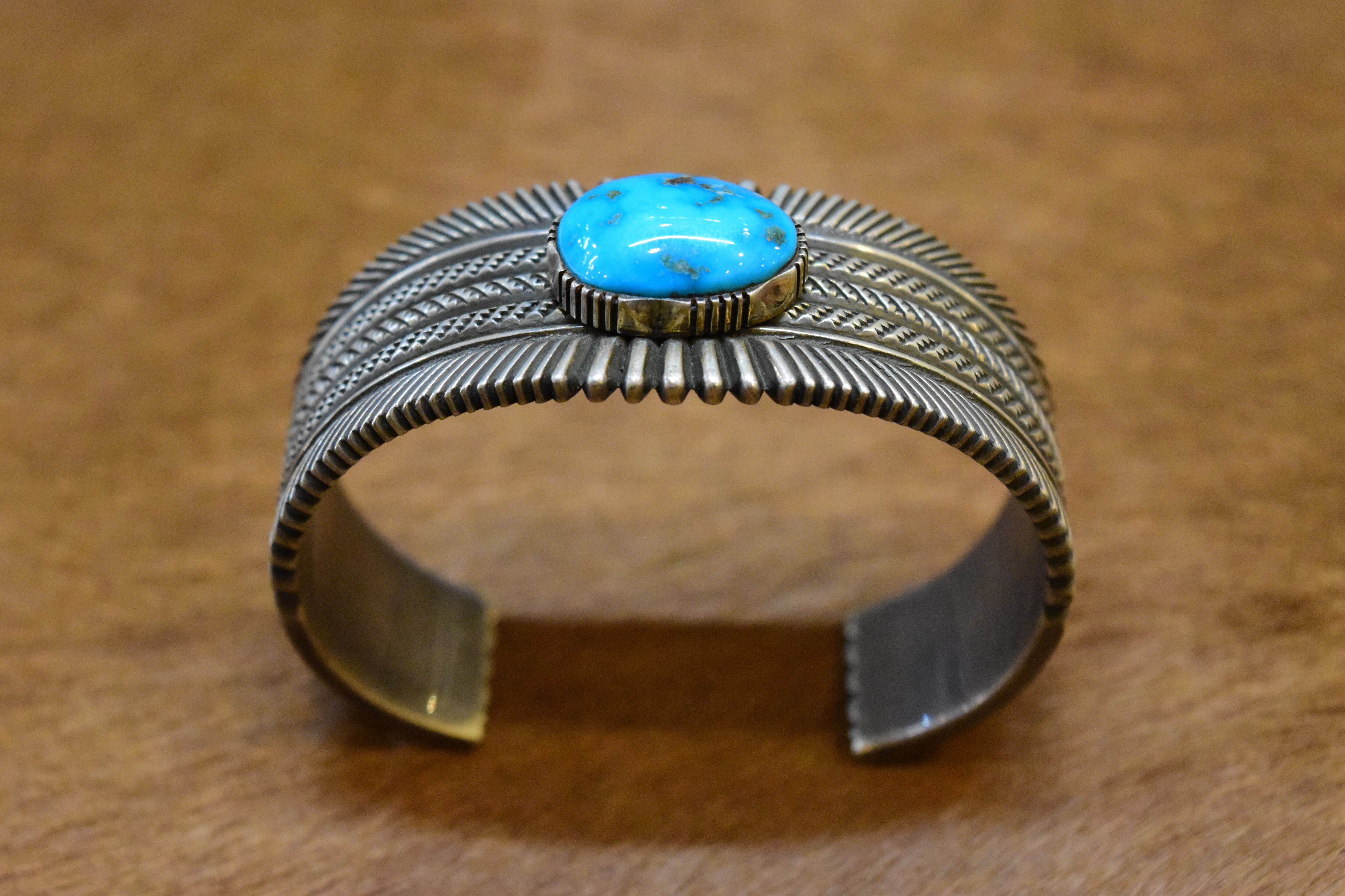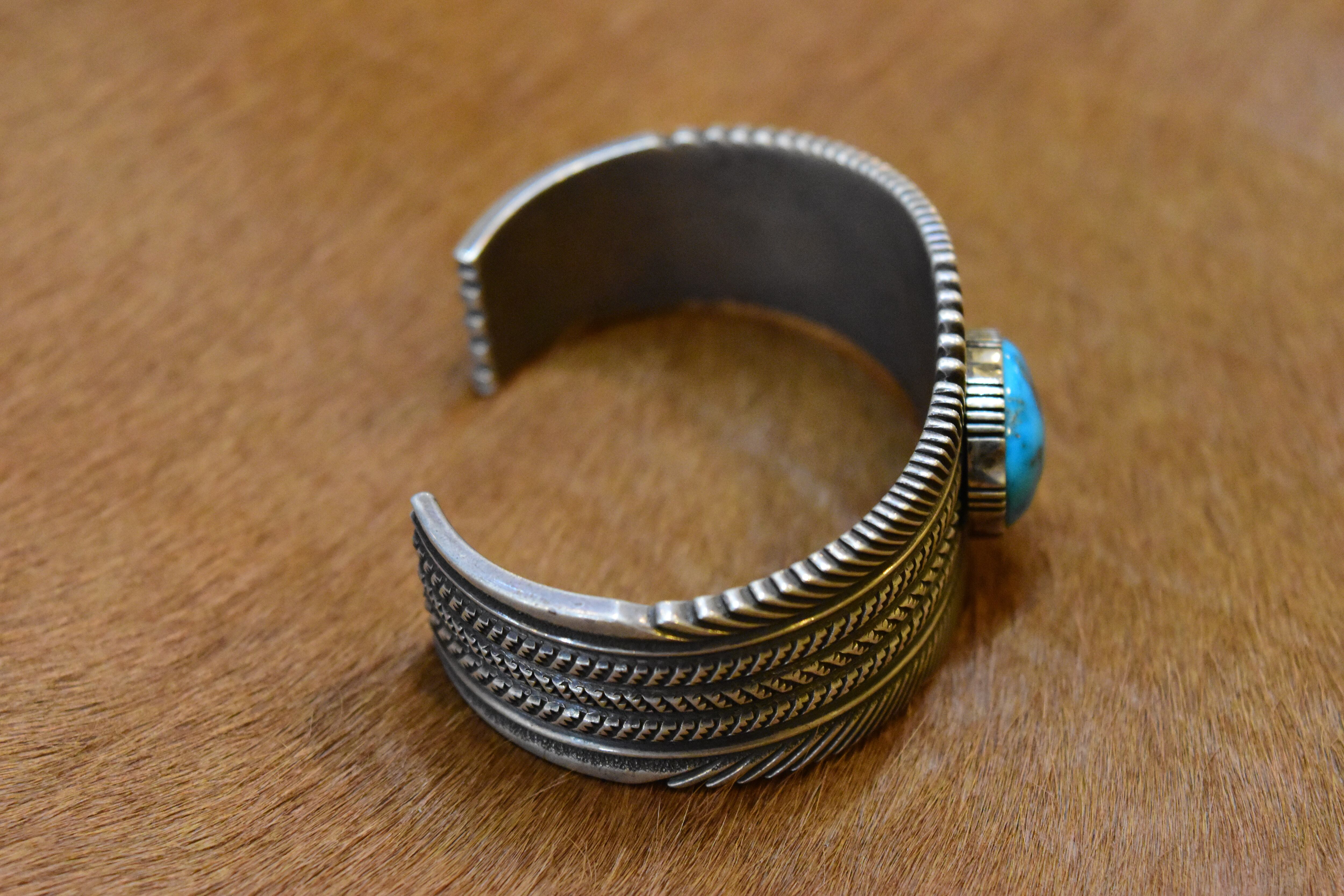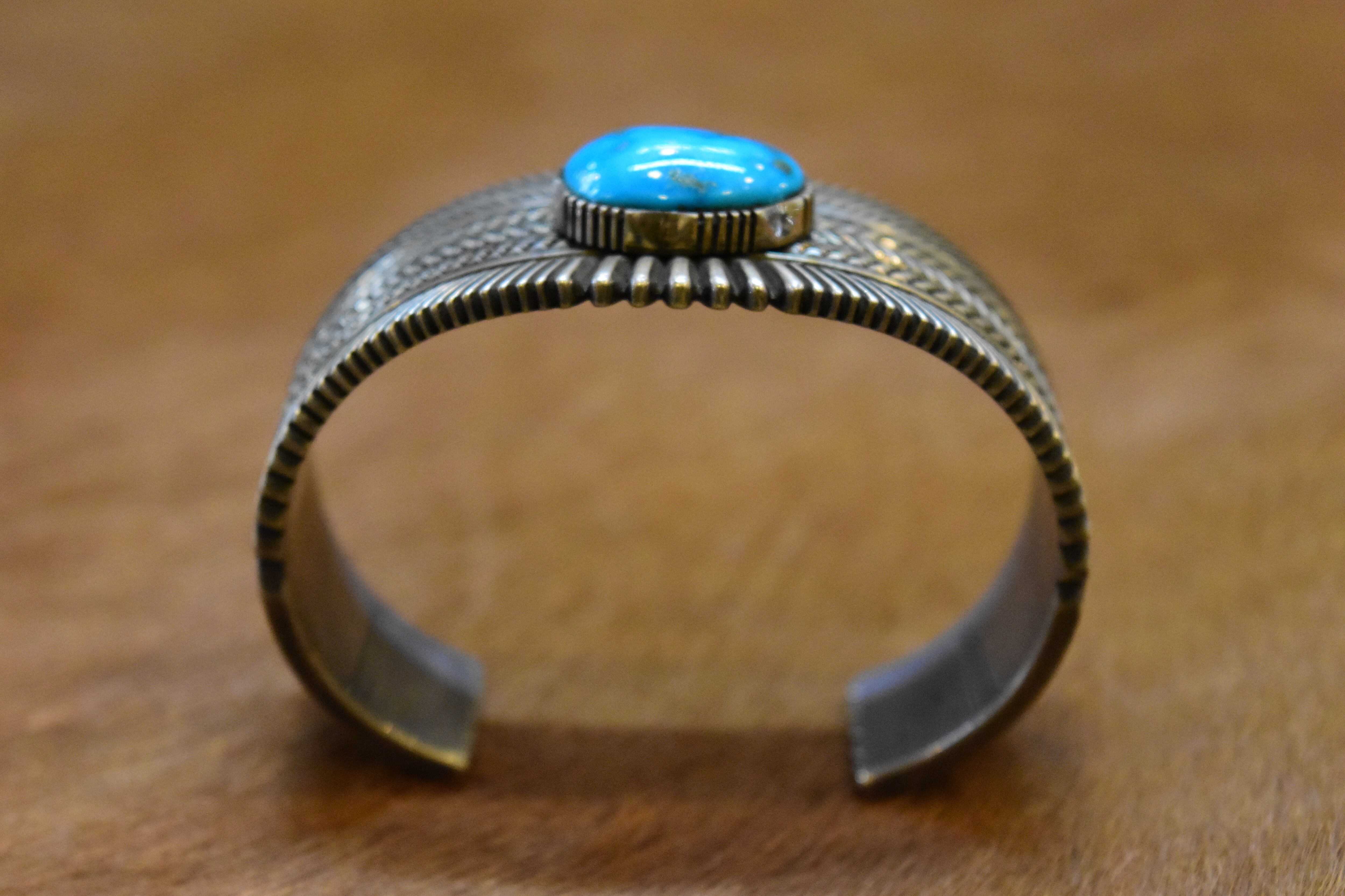 ナバホ族のアーティスト「ロン・ベドニー」による、洗練されたデザインが魅力のバングルです。特にモレンシターコイズを活かした独自のスタンプワークが、力強さと美しさを兼ね備えています。彼の手による繊細な彫りは、見た目に豊かな表情を与え、見る人を惹きつけます。