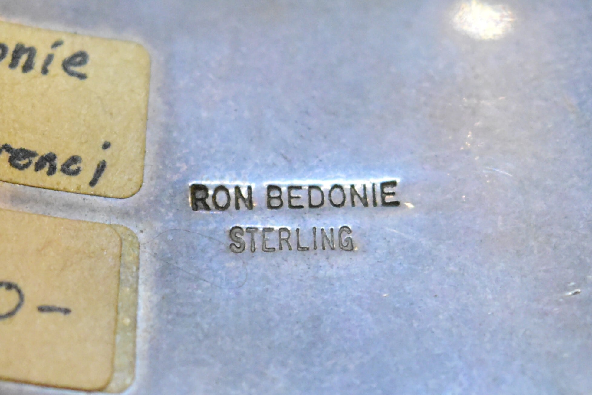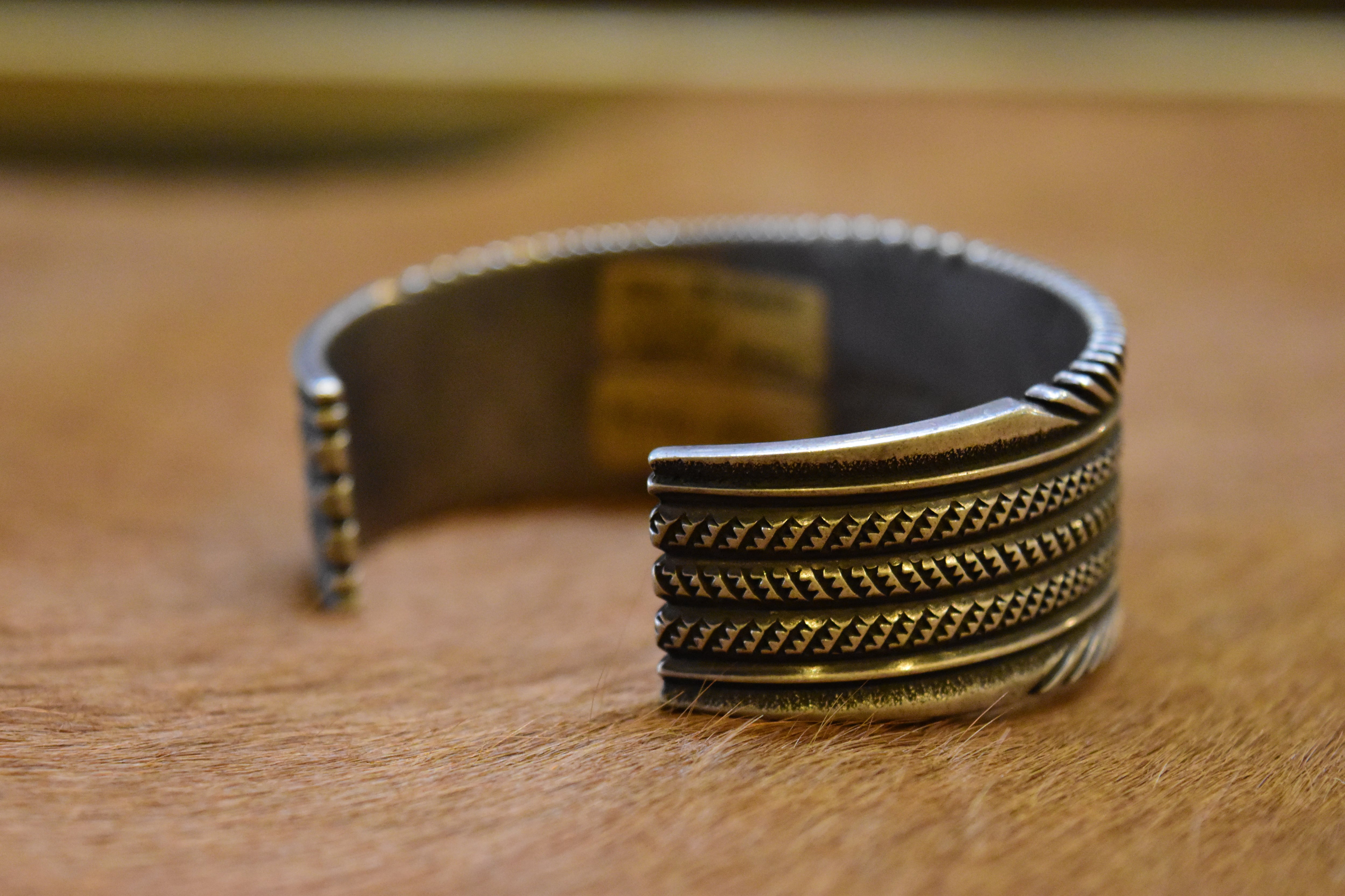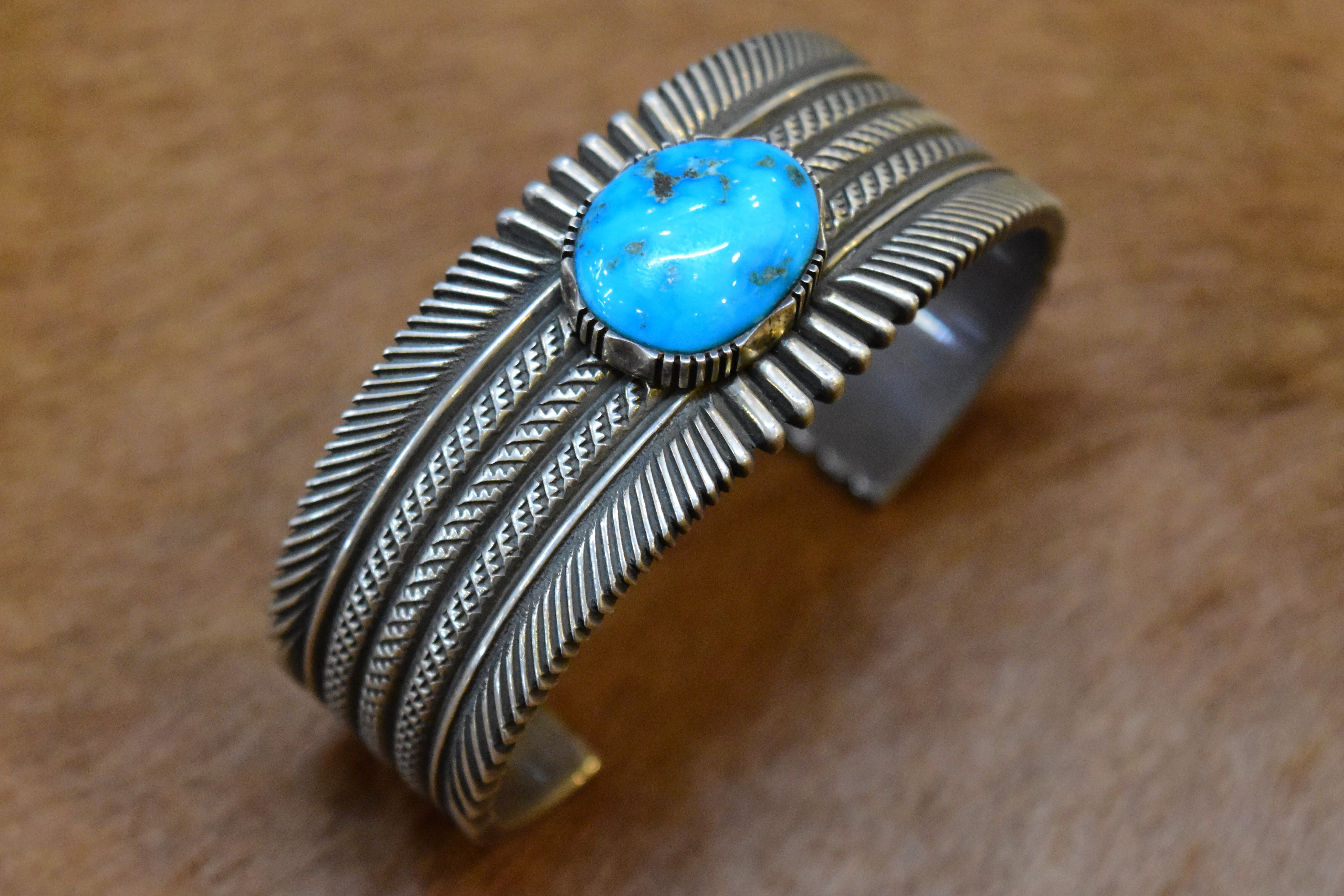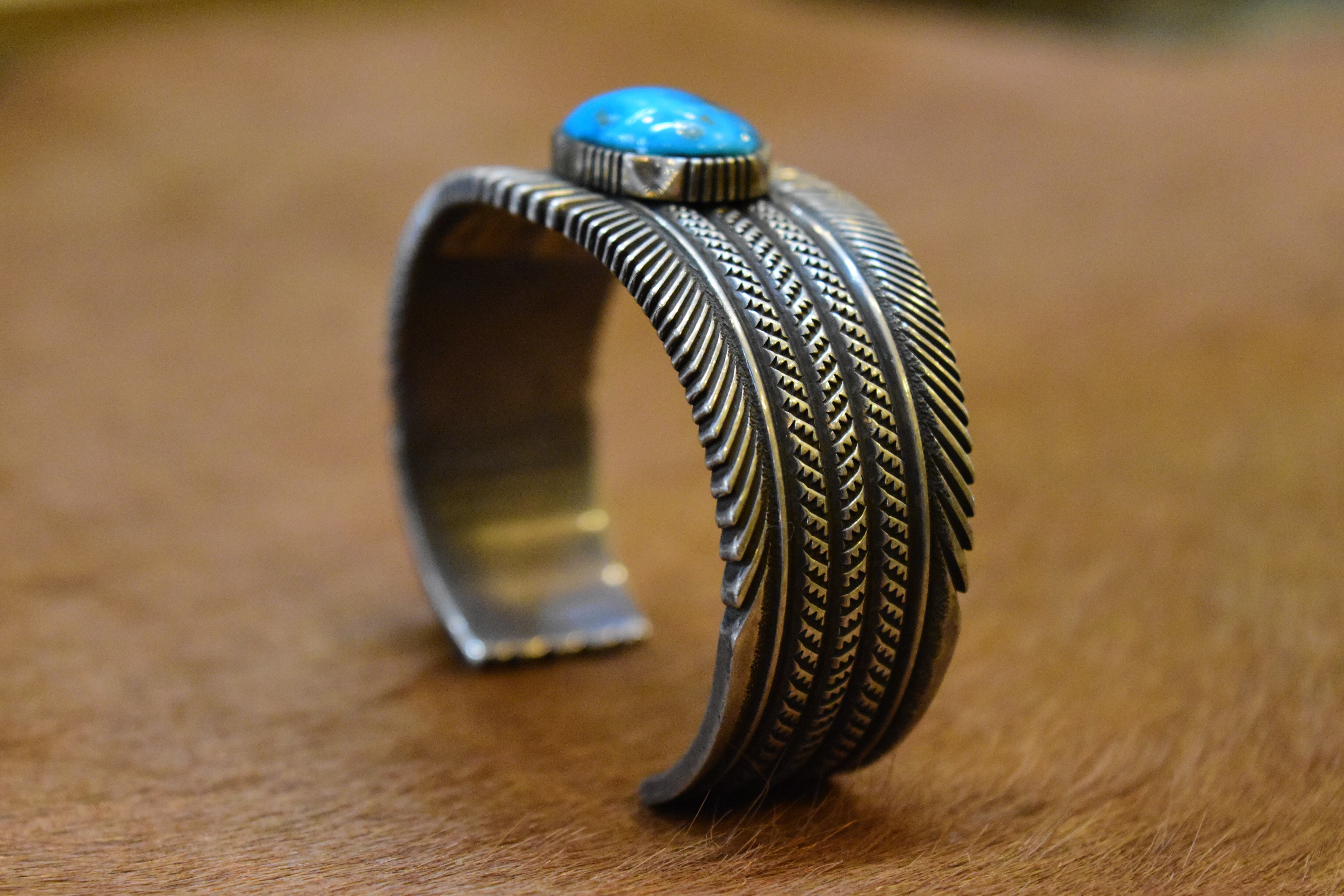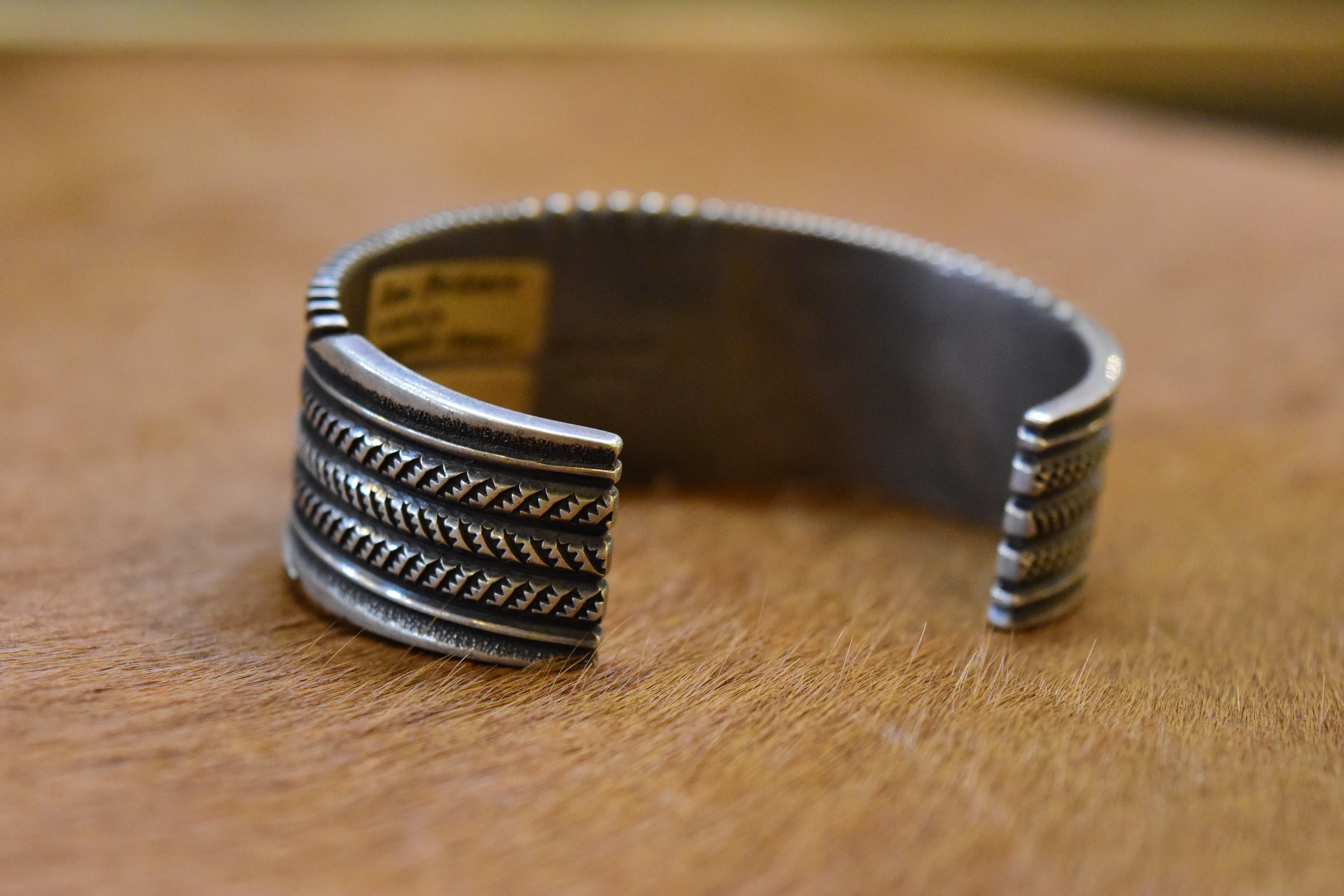 ナバホ族のアーティスト「ロン・ベドニー」による、洗練されたデザインが魅力のバングルです。特にモレンシターコイズを活かした独自のスタンプワークが、力強さと美しさを兼ね備えています。彼の手による繊細な彫りは、見た目に豊かな表情を与え、見る人を惹きつけます。