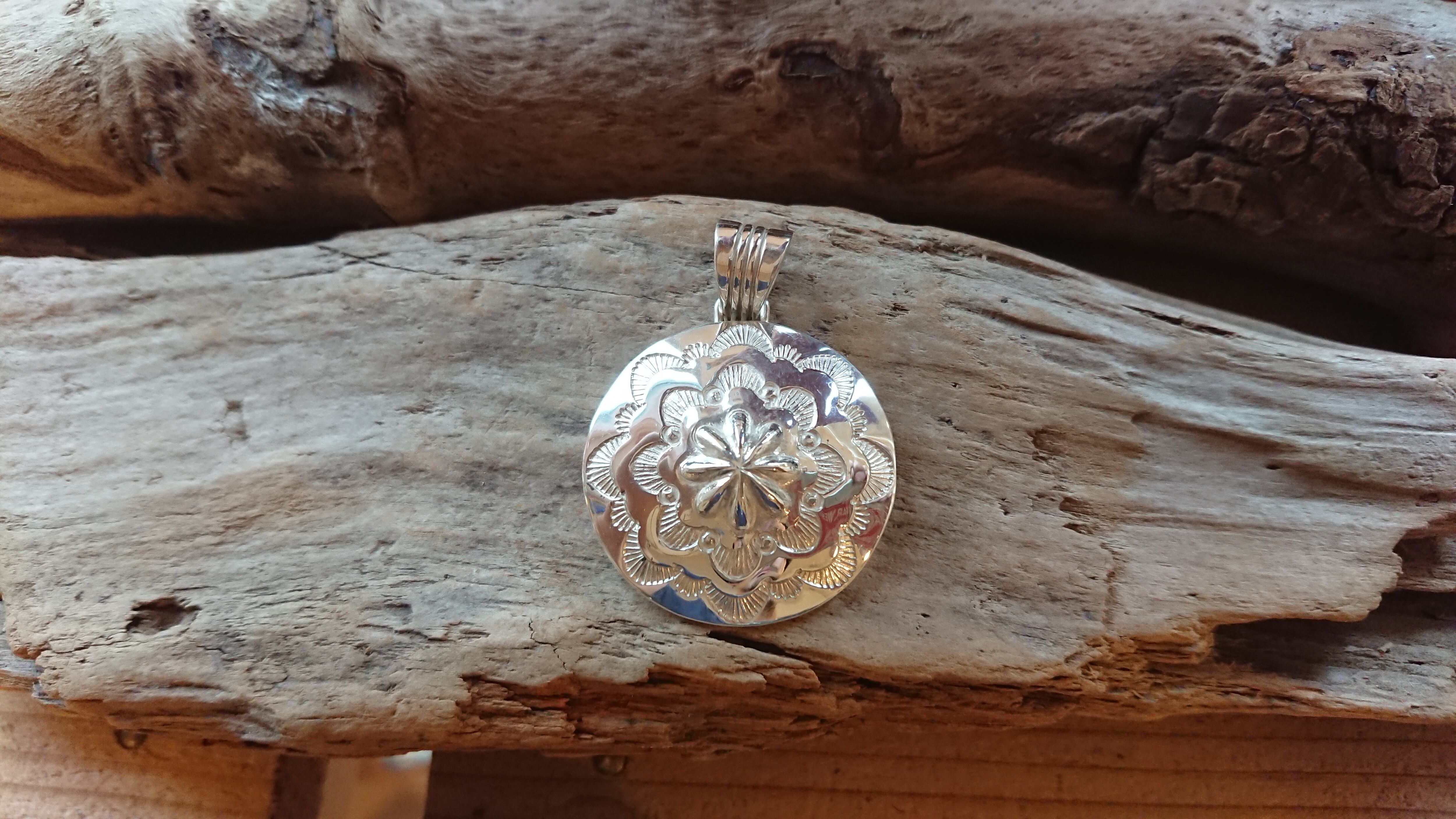 スタンプワークを施したこのコンチョペンダントは、独特のデザインと存在感が魅力的なアイテムです。