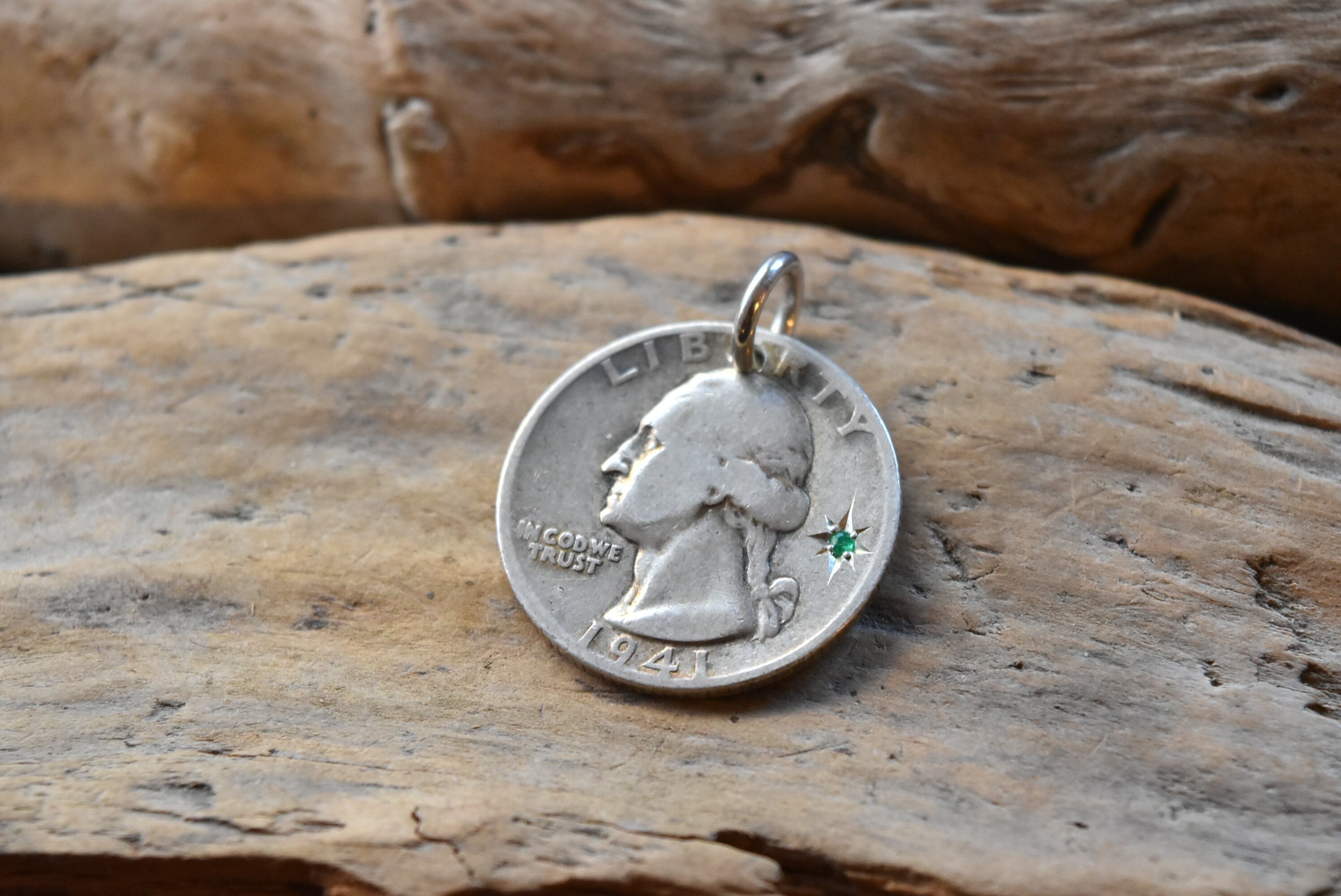 クォーター銀貨(1941年)にエメラルドをセッティングしたペンダントです。エメラルドの美しいグリーンが、光を受けて華やかに輝き、特別な一日をより華やかに演出します!