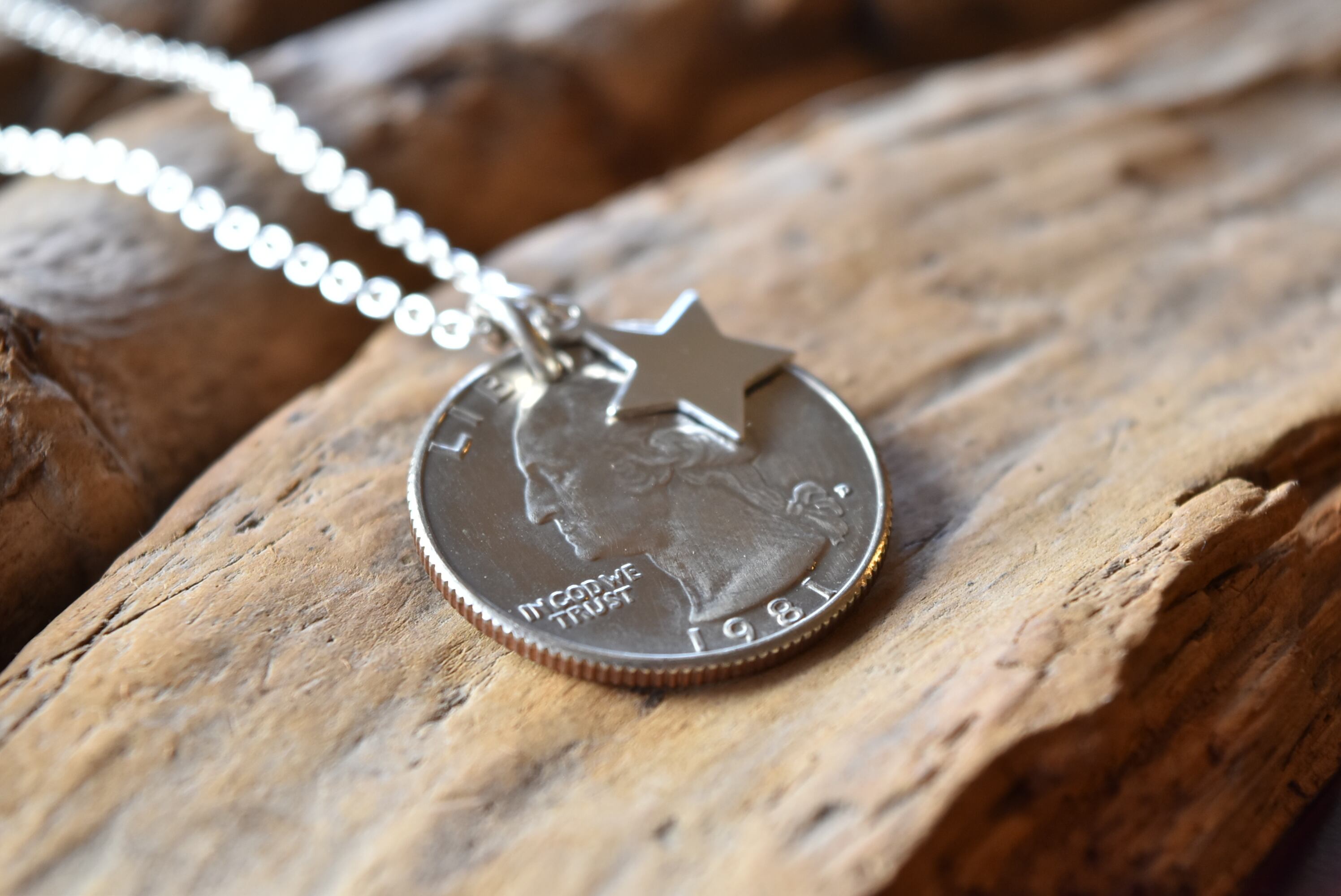 お好きな年号のコインを選べるため、特別な記念日や大切な方への贈り物にも最適なアイテムです。星形のチャームが、夢や希望の象徴としてアクセントを加えます。