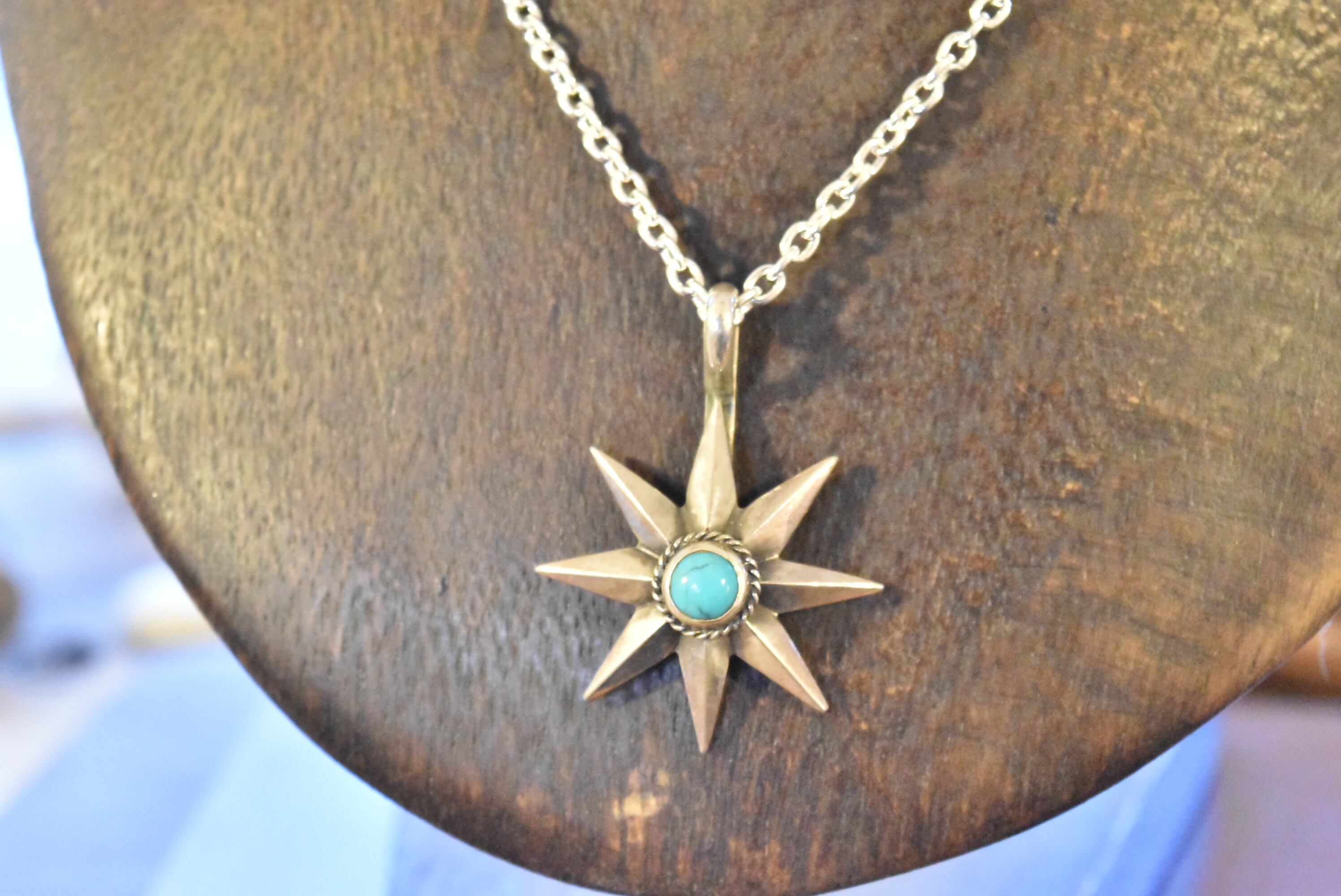 ターコイズの美しい色合いと八芒星の神秘的なデザインが際立つネックレスです!このアイテムは、天然石の魅力を最大限に引き出す仕上がりです!